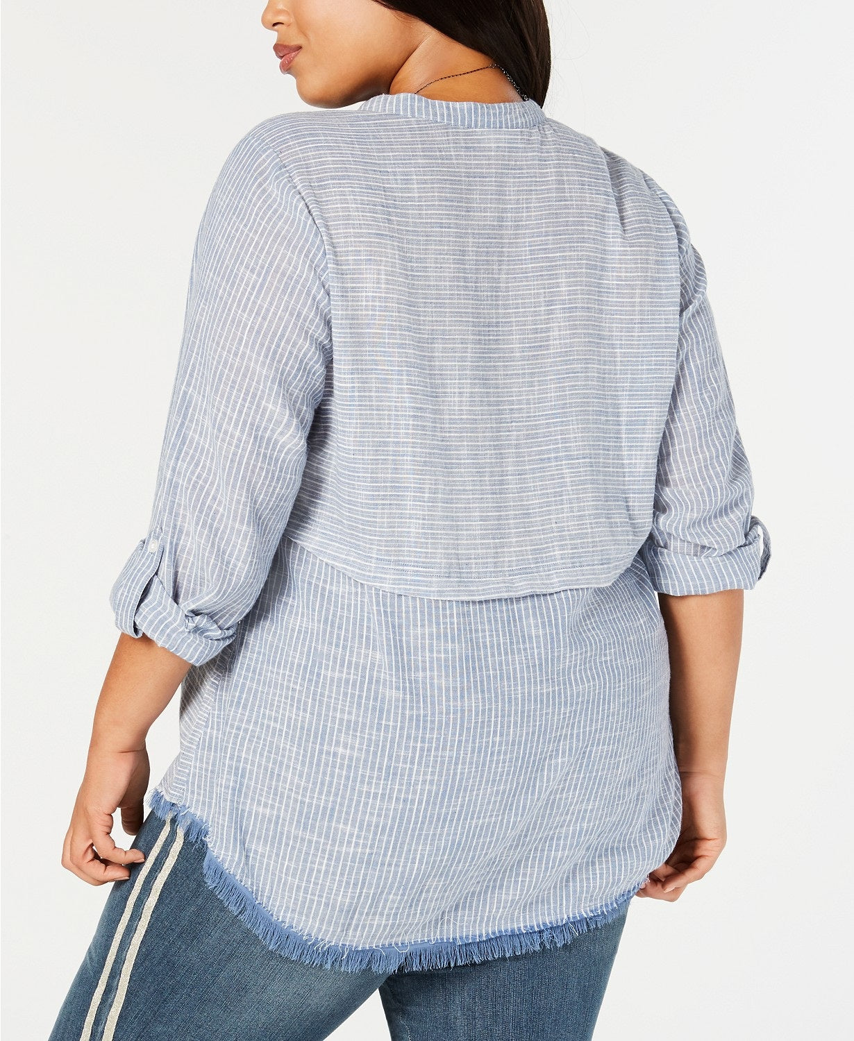 Relaxed fit; hits at hip; | Split V-neckline; button-front closure | Fringe-trimmed chest pocket and shirttail hem | Long roll-tab sleeves | All cotton | Machine washable | Imported