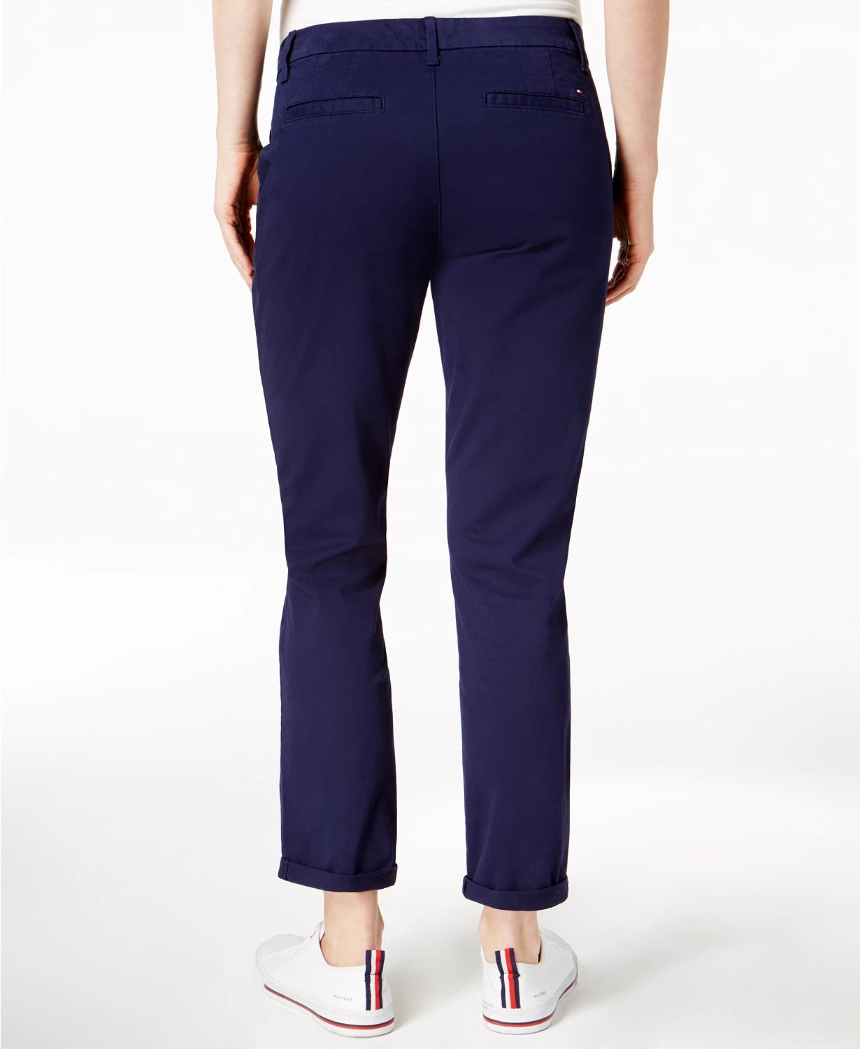 Button and zipper closure; belt loops|Off-seam pockets at front; faux welt pockets at back|Straight leg cropped at ankle; cuffed hem