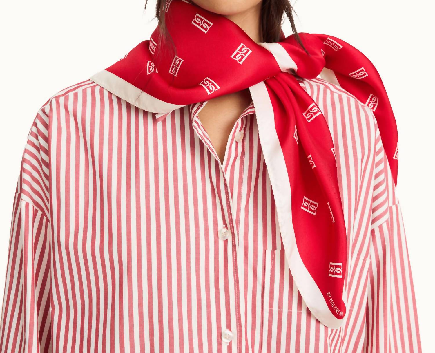 Both classic and versatile with the endless ways you can wear it. Elevate your accessory collection with the Monnas Silk Scarf by BY MALENE BIRGER, showcasing a luxurious red shade with an elegant monogram print. Crafted from 100% silk, this classic piece exudes sophistication and timeless style. Perfect for adding a touch of class to any outfit, this scarf is an essential wardrobe staple.
