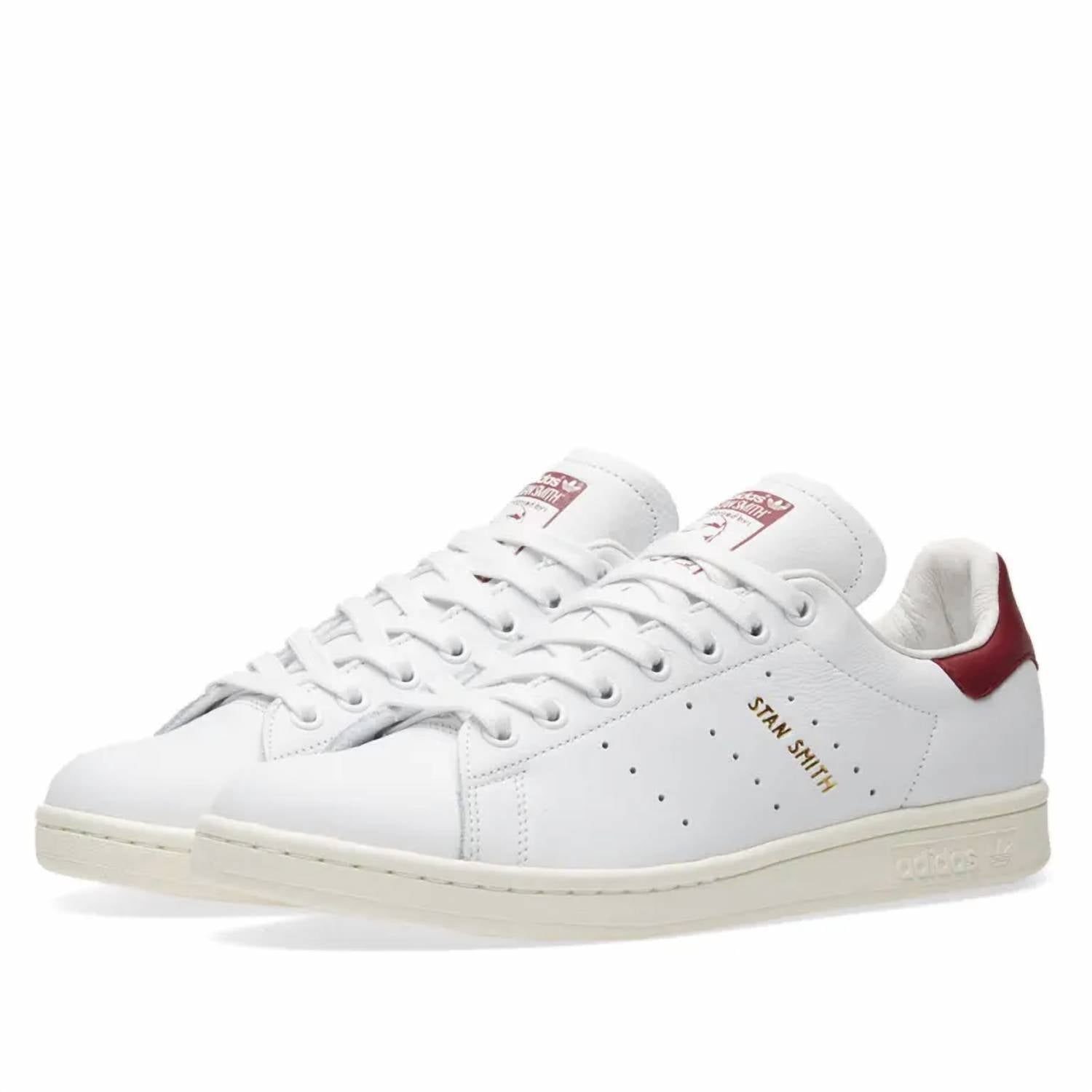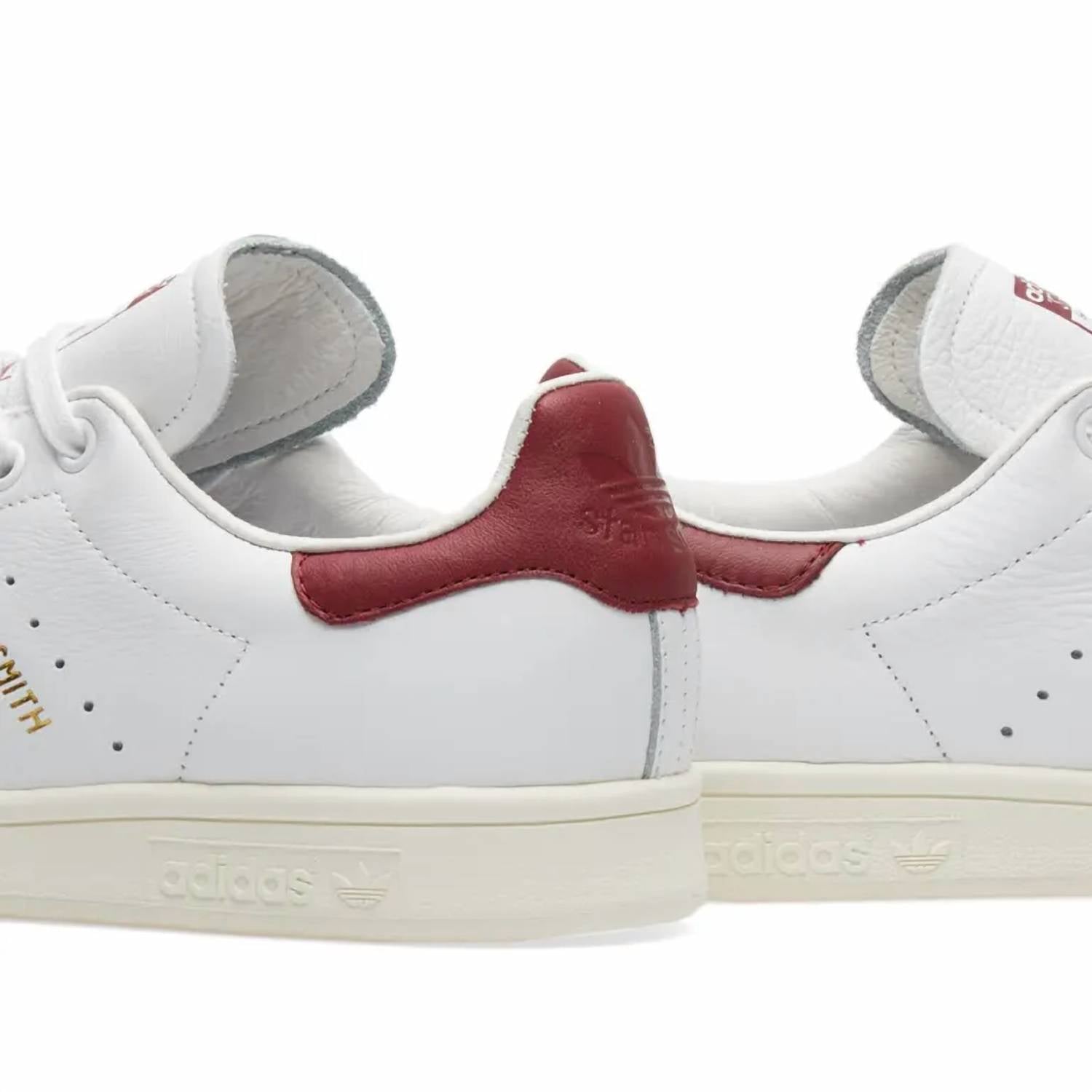 Meet the Men's Originals Stan Smith Sneaker in White/Burgundy by adidas, a modern take on a classic style. The sneaker features leather uppers and lining, with a perforated 3-Stripes design on the sidewalls and branding throughout. Comfort is assured with an OrthoLite® sockliner and a rubber cupsole reminiscent of the '70s original. Designed for men, this timeless sneaker provides both style and comfort with every step.