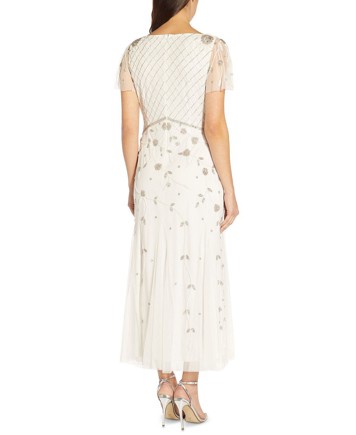Hints of vintage-inspired fashion come together for a gorgeously detailed look on this beaded dress by Adrianna Papell.| Approx. 53-1/2 long from center back neck to hem. Length varies 1/4 between sizes | V-neck| Concealed back zipper closure| Short flutter sleeves| Beaded pattern throughout; godets at skirt| Lined