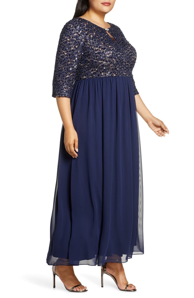 58 length|Hidden back-zip closure|Bateau neck with keyhole|Three-quarter sleeves|Gathered skirt|Lined|Bodice is 65% nylon