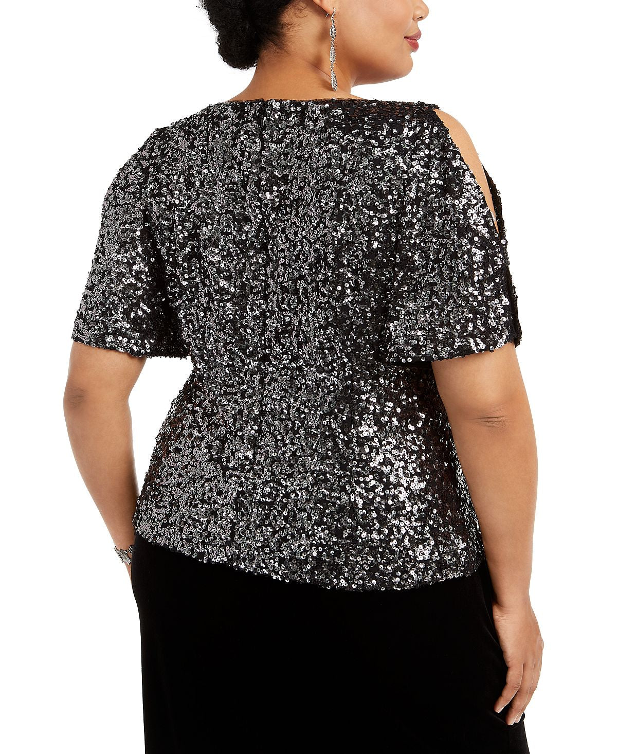 Light up the night in this totally sequined option from Alex Evenings—a silvery| shoulder-dusting style that looks great with everything.| Approx. 22 long from center back neck to hem. Length is based on size 4 and varies 1/4 between sizes| Scoop neckline| Silver-tone sequins allover | Slits at sleeves