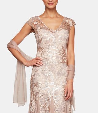 Alex Evenings Women's Embellished Lace Embroidered Illusion Gown & Shawl Brown Size 8