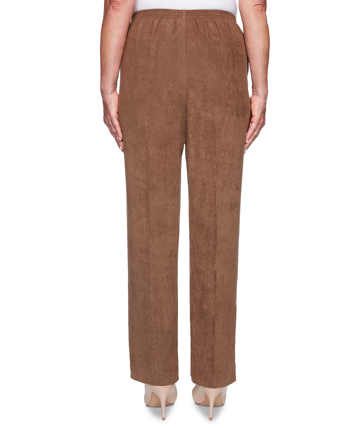 Add a luxe touch to your wardrobe with faux-suede petite pants from Alfred Dunner. This pair pulls on for comfort and style combined.| Approx. Medium inseam; 28-1/4| Approx. Short inseam; 26-3/4| Mid rise; relaxed fit through hips and thighs; straight leg| Designed to fit and flatter 5'4 and under frame| Pull-on styling| Faux suede fabric