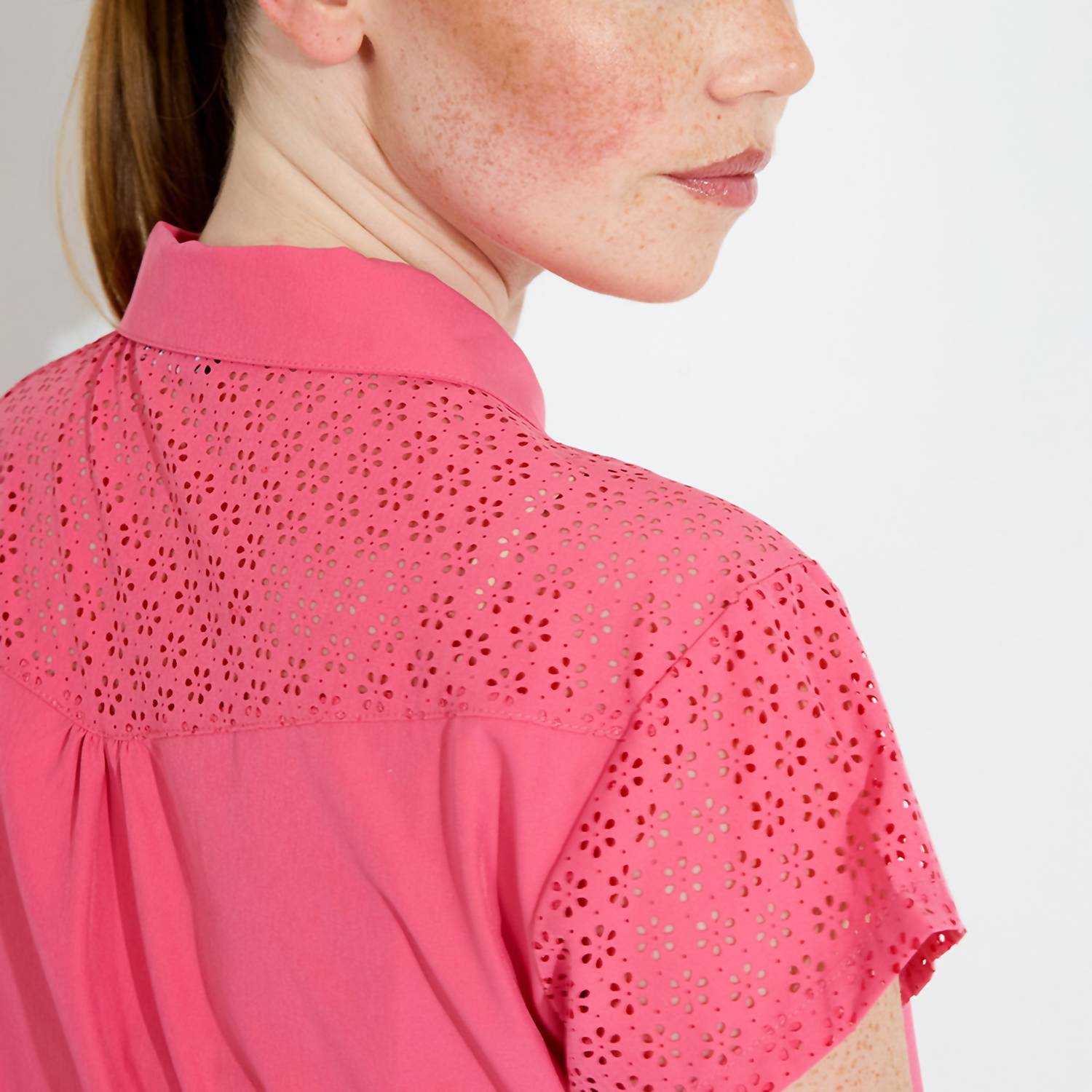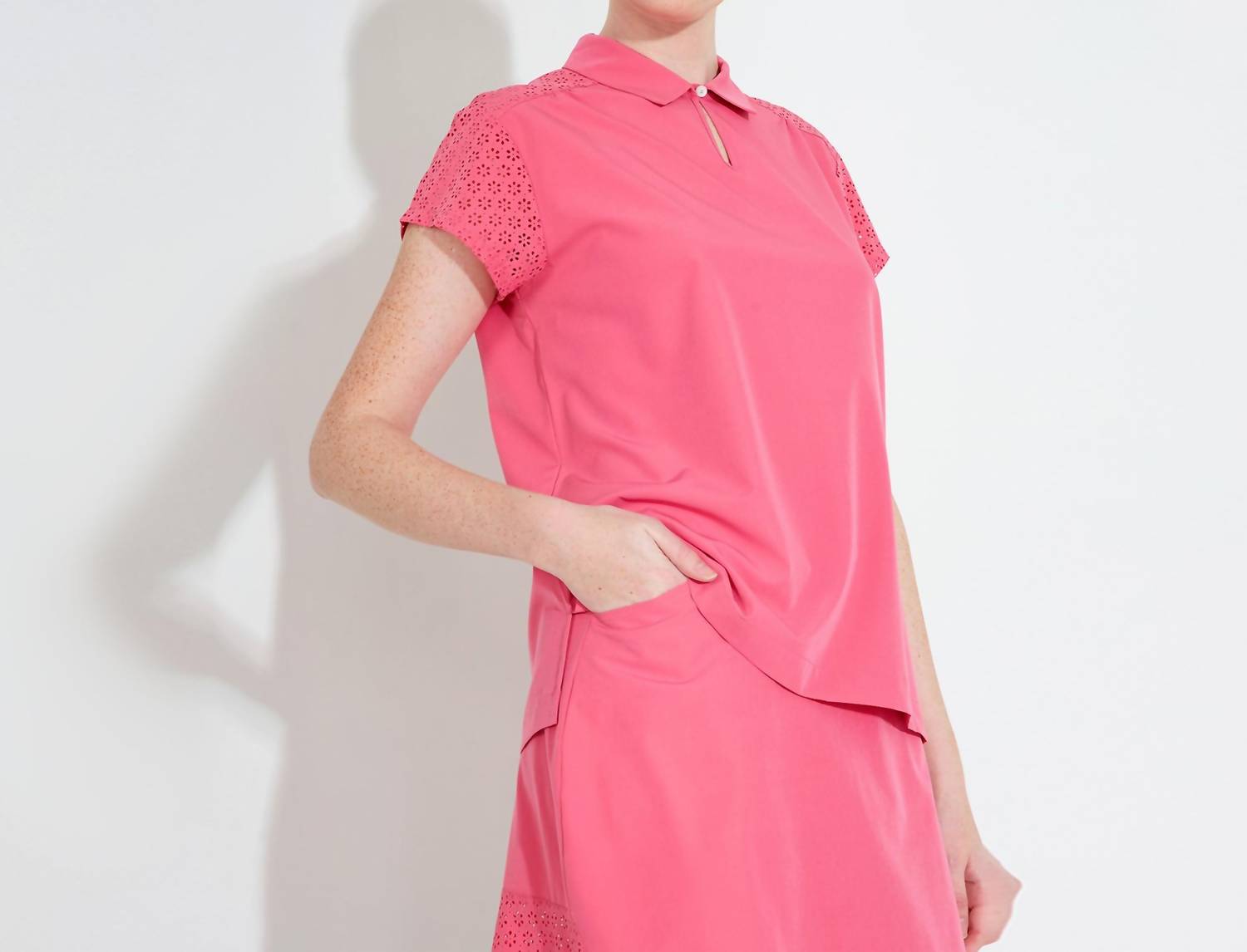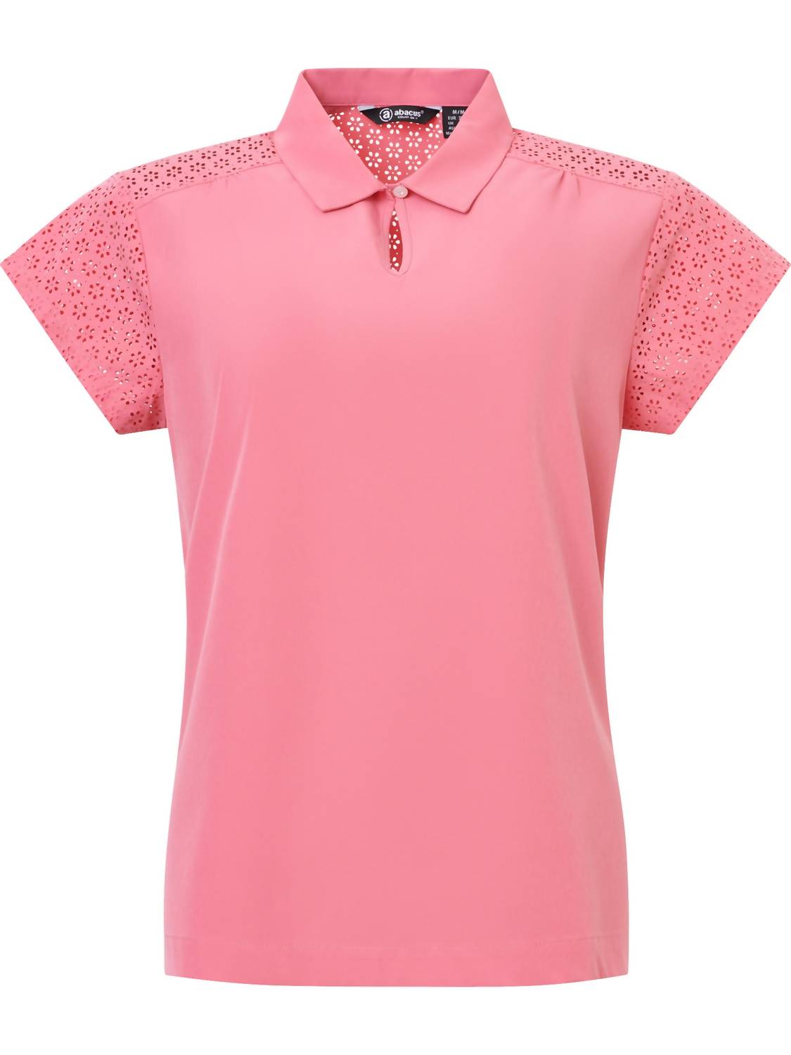 This classic, short sleeve tee will be your go-to staple this season and beyond. Introducing the Manga Cupsleeve Polo by Abacus Sportswear US, a stylish choice for active women. This lipstick-colored short sleeve top is crafted from breathable polyester with 4-way stretch, perfect for summer and game days. The intricate flowery pattern and decorative rhinestone button at the collar add a touch of elegance to this solid design. Closure: Pull on. Care: Machine wash and tumble dry.