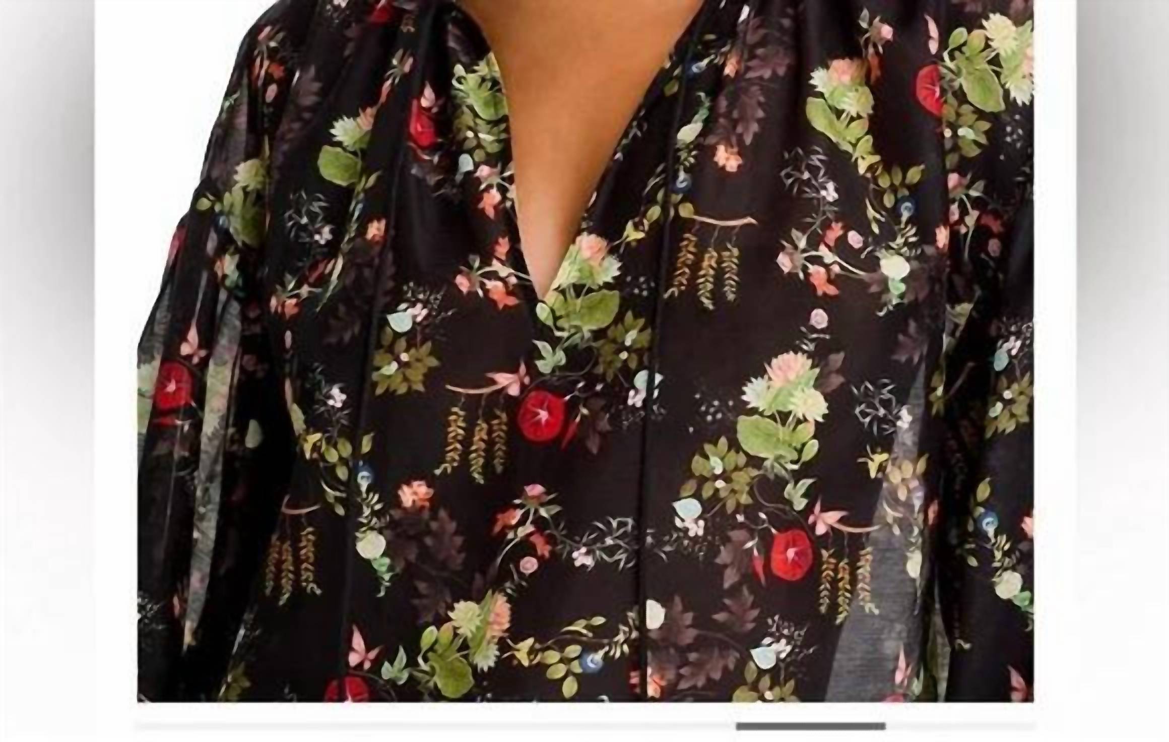 A versatile blouse that works from desk to dinner! Elegant blouse with colorful floral design. Features stylish puff sleeves. Cotton/Silk Blend • V-neck • Elbow-length blouson sleeves • Smocked cuffs • Printed