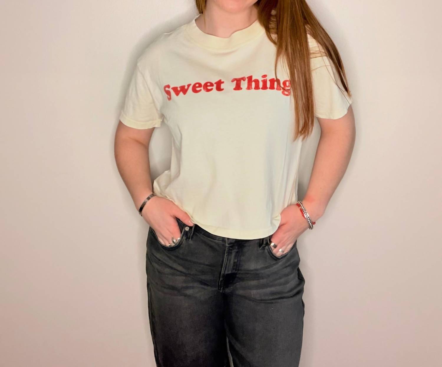 This classic, short sleeve tee will be your go-to staple this season and beyond. Elevate your streetwear collection with the Sweet Thing Crop Top by All of Us, tailored in a charming butter hue. Designed with short sleeves and a classic crewneck, this graphic tee is perfect for summer versatility. Made for women who love effortless style, this wide crop top is a pull-on piece.