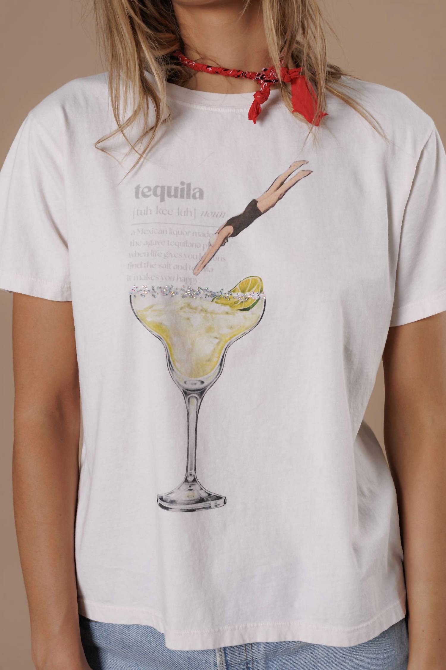 Look no further, you just found your perfect tee! Introducing the Tequila Dive Boy Tee by All of Us, an essential summer staple perfect for streetwear style. This women's tee boasts short sleeves and a classic crewneck in a stylish cream color. Made from 100% cotton, it offers a comfortable and breathable fit suitable for vacations. With a pull-on closure, this graphic tee is easy to wear and care for with machine washing.