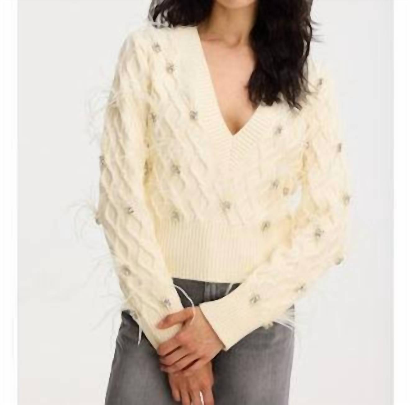 Elevate your holiday wardrobe with the stunning Briar V-neck Sweater by Allison New York, featuring luxurious long sleeves and an exquisite textured pattern. This ivory sweater offers a sophisticated pull-on closure for effortless elegance. Crafted with attention to detail, it is the perfect blend of style and comfort. Care: Dry clean only.