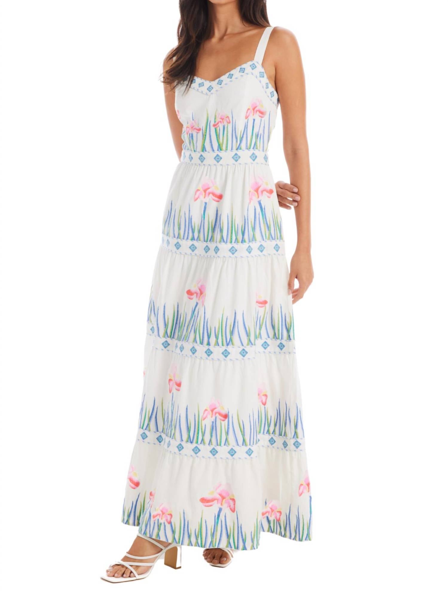 Style this maxi with your favorite statement necklace and sandals for the perfect look. Discover the Embroidered Lila Dress by ALLISON NEW YORK, a captivating blend of elegance and embroidery in White Multi. This sleeveless masterpiece, crafted from 100% cotton, features a charming sweetheart neckline and an A-line silhouette, accentuated by a tiered maxi skirt measuring 48.25 inches in length. The dress offers a comfortable fit with a smocked bodice and adjustable straps, finished with a zip closure at the back. Care for this exquisite piece by hand washing in cold water and laying flat to dry.