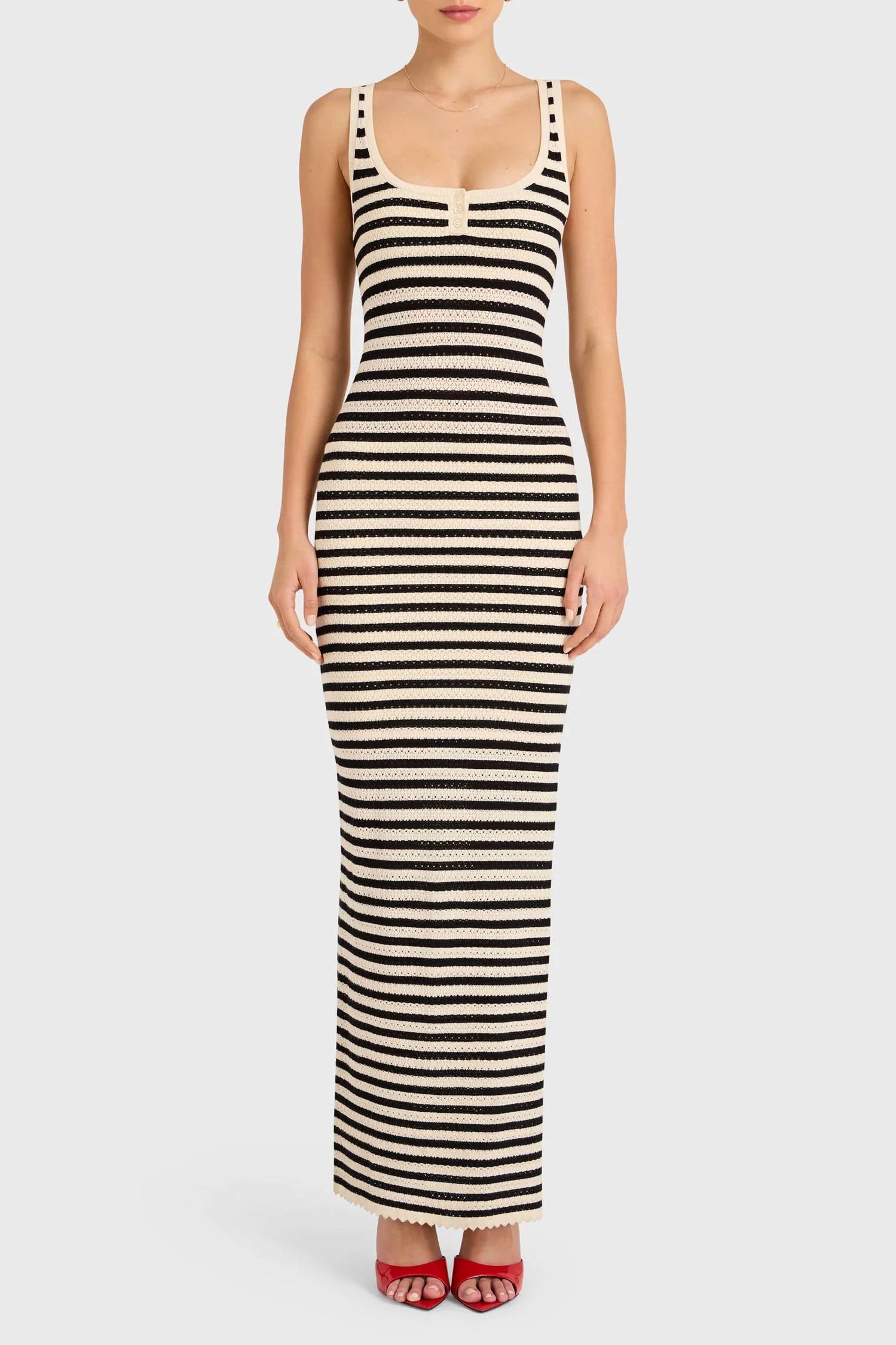 The perfect length dress does exist. Description This flirty design features a subtle scalloped edge trim for a polished yet playful touch. Pair it with your favorite flats for a French-inspired look. Perfect for: Weekend getaways, casual lunches, daytime adventures Fabric: Lightweight, super-stretch knit Stripe pattern Buttons at bust Scoop neck Pullover design, no closure Shell: 70% viscose/30% polyester Lined Hand wash
