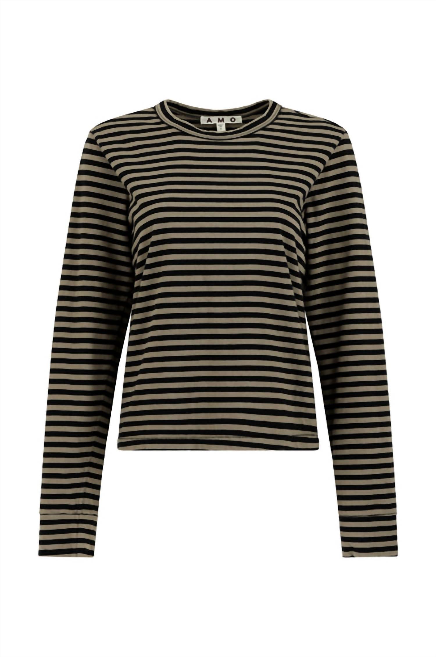 The perfect long sleeve tee that goes with just about anything. Introducing the Love Long Sleeve Tee by AMO, a perfect choice for effortless layering or standalone chic. This women's tee features long sleeves and a classic crewneck in a striking sand/black stripe pattern. Crafted from a sustainable blend of 60% BCI Cotton and 40% Recycled Cotton, it's made with care in Los Angeles. With a convenient pull-on style, maintain its soft quality by machine washing cold and either hanging to dry or using low heat in the tumble dryer.