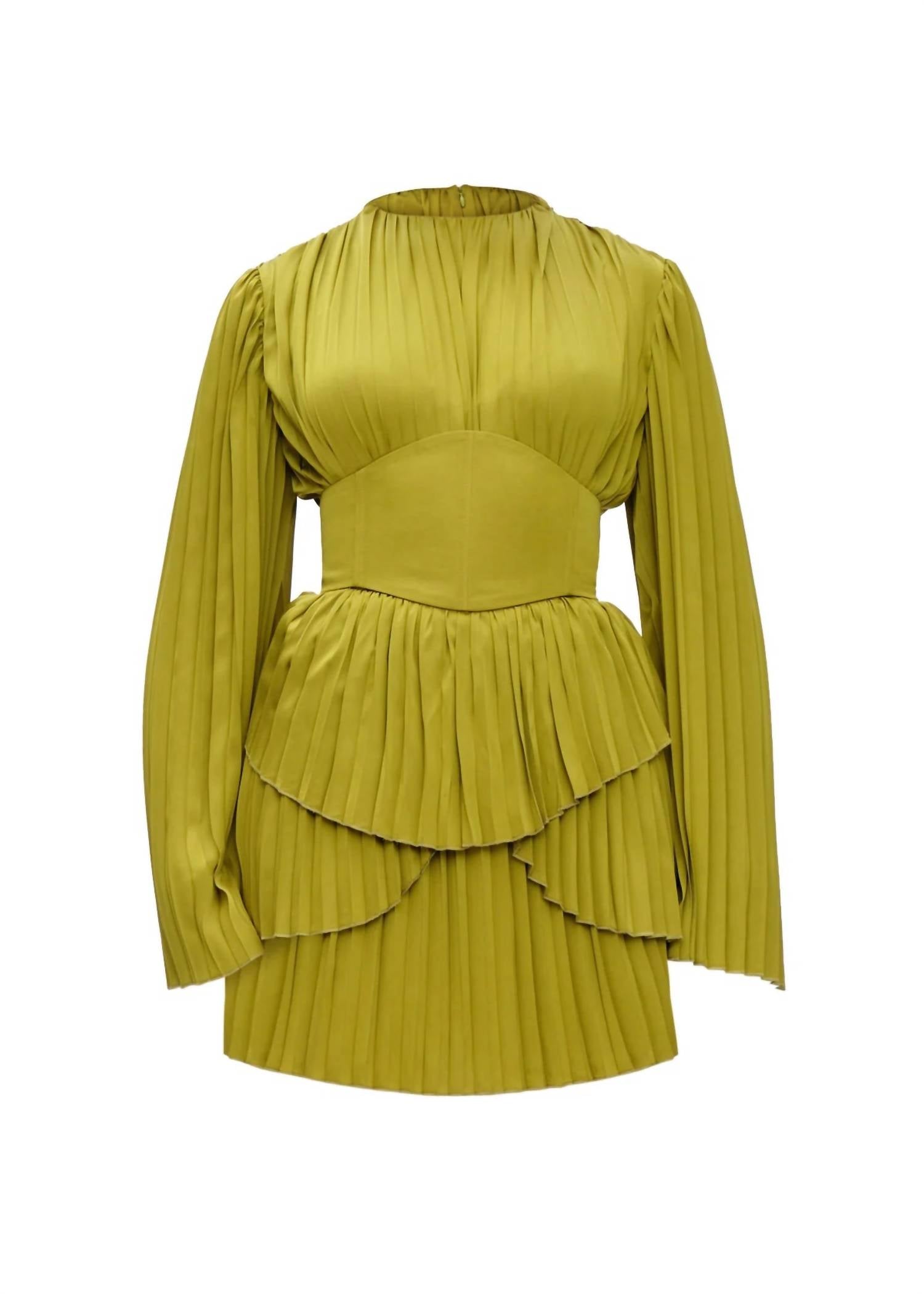 Introducing the Women's Lenti Pleated Mini Dress by Andrea Iyamah, a chic choice for an evening event with its maximalist flair. The dress features long flared set-in sleeves and is constructed from 96% polyester and 4% spandex. This fit-and-flare silhouette showcases a pleated mock neck, layered skirt panels, and comes with a separate functional corset belt that ties at the back. It has an invisible zip closure with a hook-and-eye finish, emphasizing style and comfort.