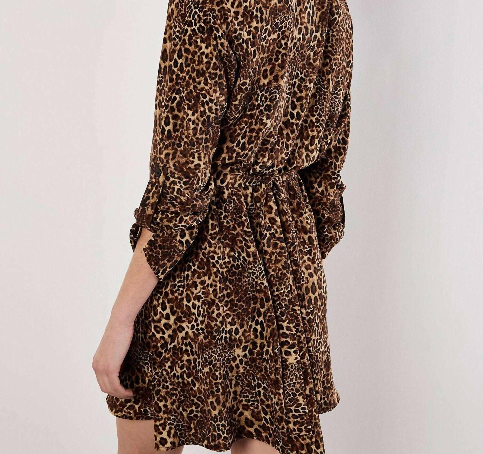 Meet the Women's Leopard Crepe Belted Dress by APRICOT, an ideal choice for both office and evening outings. This mini dress in bold animal print features long sleeves and a shirt silhouette with a crisp collar. Crafted from 100% Polyester with a button closure, it includes an attached fabric belt for a flattering fit. Approximately 34" in length, it embodies Boho Chic style, perfect for fall occasions.