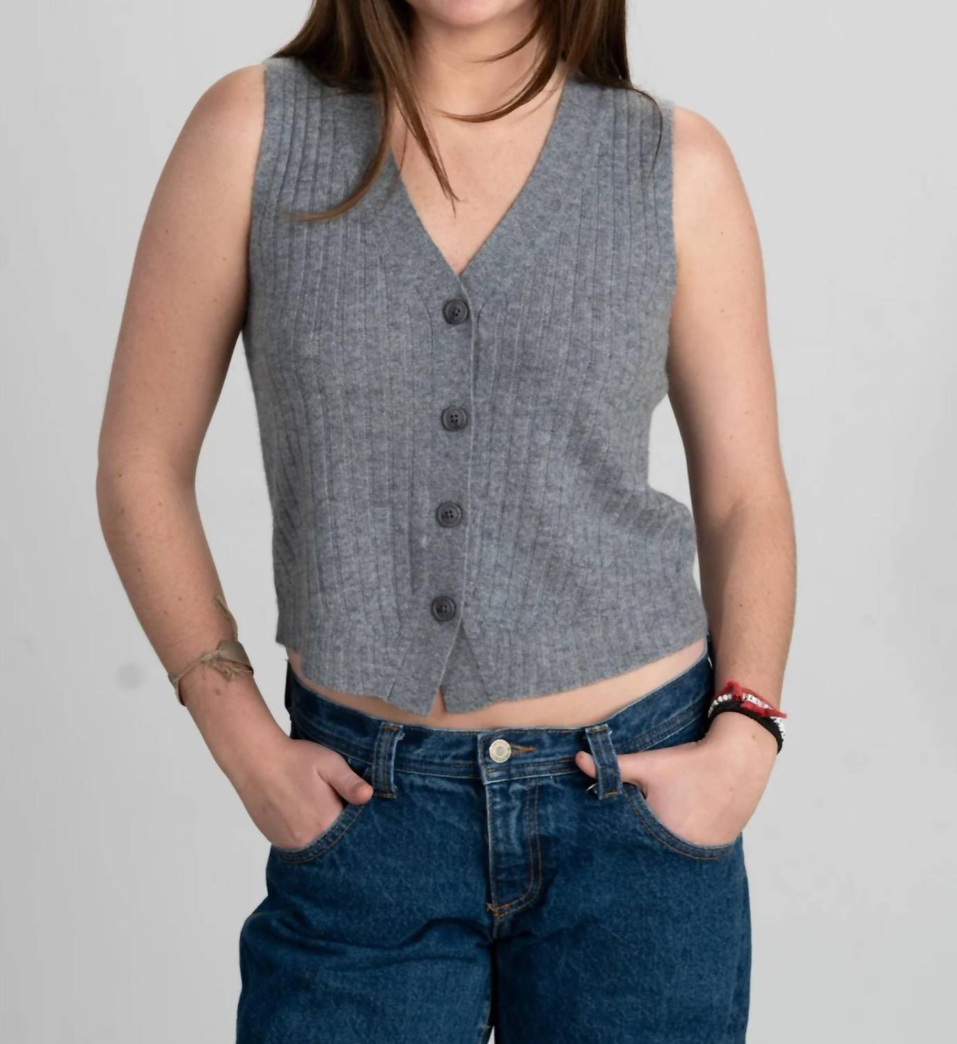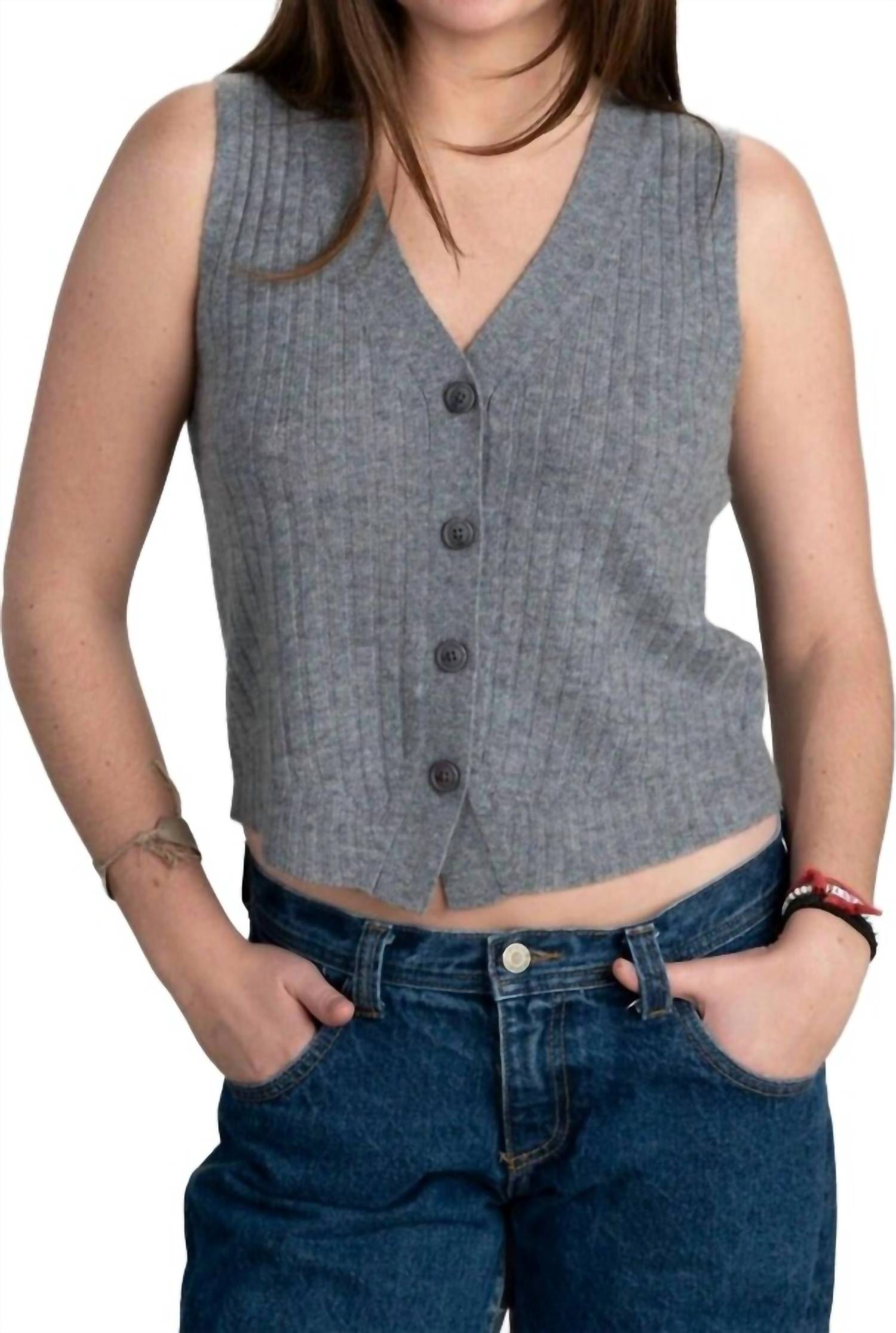 Throw this vest over an all black outfit for a perfectly polished look. Elevate your wardrobe with the Tony Ribbed Vest by Archer Cashmere, a sophisticated piece in Heather Grey designed for versatile styling. This sleeveless vest features a V-neck design with a textured pattern, and its button closure enhances the elegant look. Perfect for summer occasions, it effortlessly transitions from workwear to special events. Care: Dry clean only.