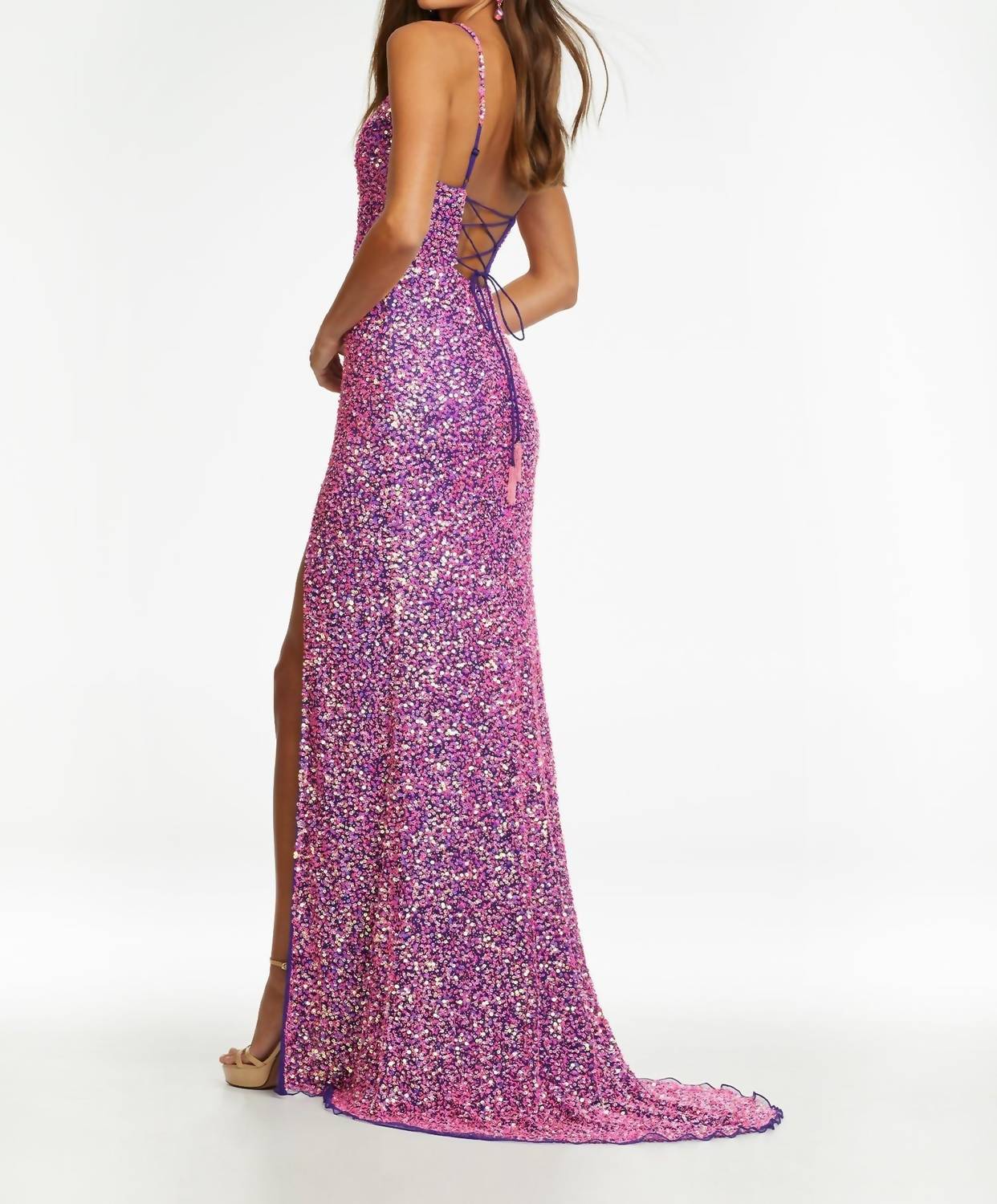 Turn heads in the cutest and most flattering evening dress. Discover the Hand Beaded Gown by ASHLEYlauren, a sophisticated piece perfect for making a statement at your next event. Designed with spaghetti straps and a V-neck, this gown is adorned with luxurious sequins and features a stylish slit for added allure. Its textured pattern epitomizes quiet luxury in the sheath silhouette, ensuring you stand out. This gown offers a lace up back closure.