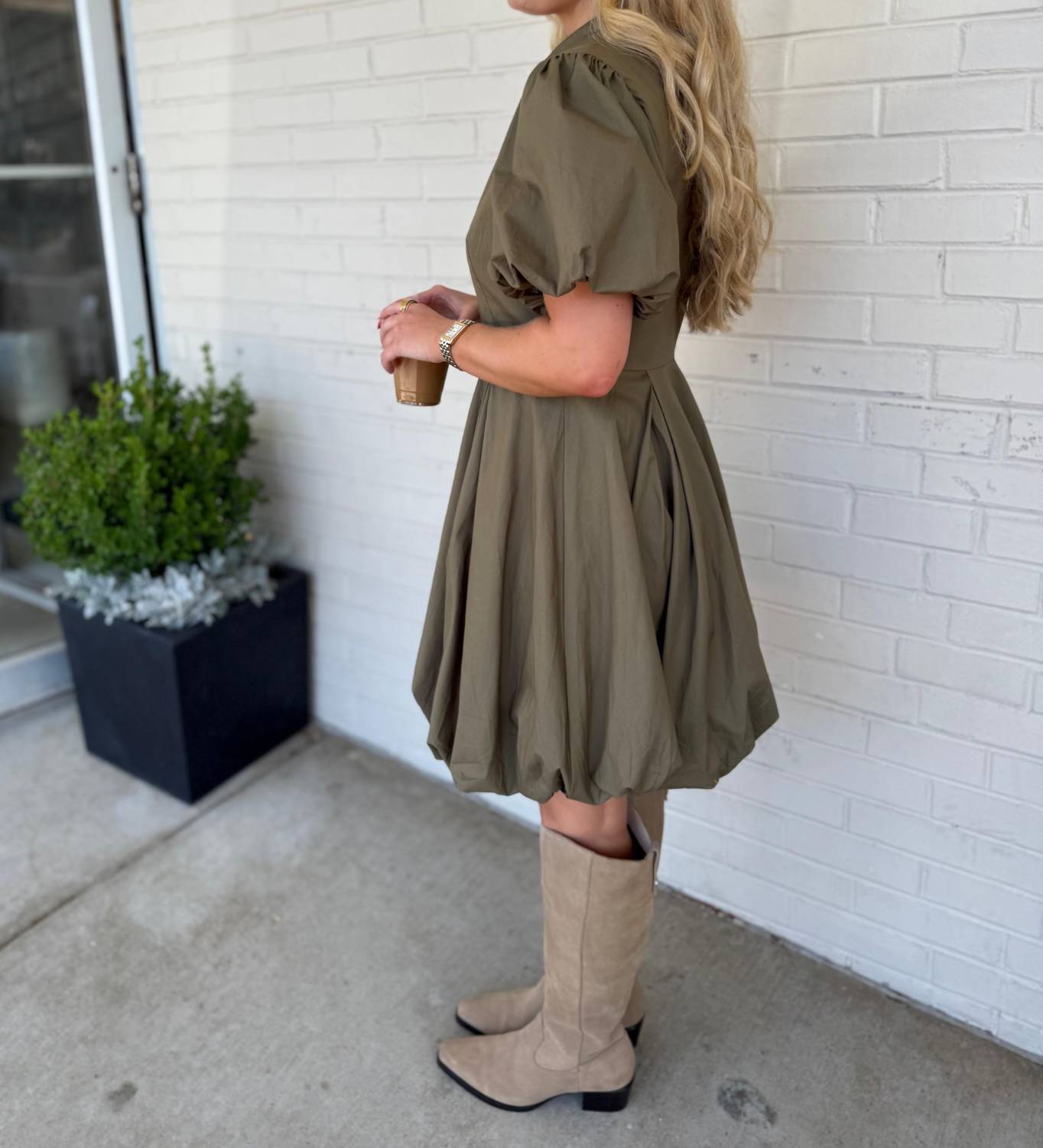 The kind of easy and flattering dress you'll be reaching for all season long. Introducing the Marie Bubble Hem Mini Dress by Aureum, a striking piece in elegant olive designed to elevate your summer style. This mini dress features short puff sleeves, a refined collar, and a button-front closure. The flattering pleated waist and playful bubble hem create a fit-and-flare silhouette perfect for minimalist engagement occasions. Made for women, this solid-patterned dress delivers subtle elegance for those moments you want to stand out.