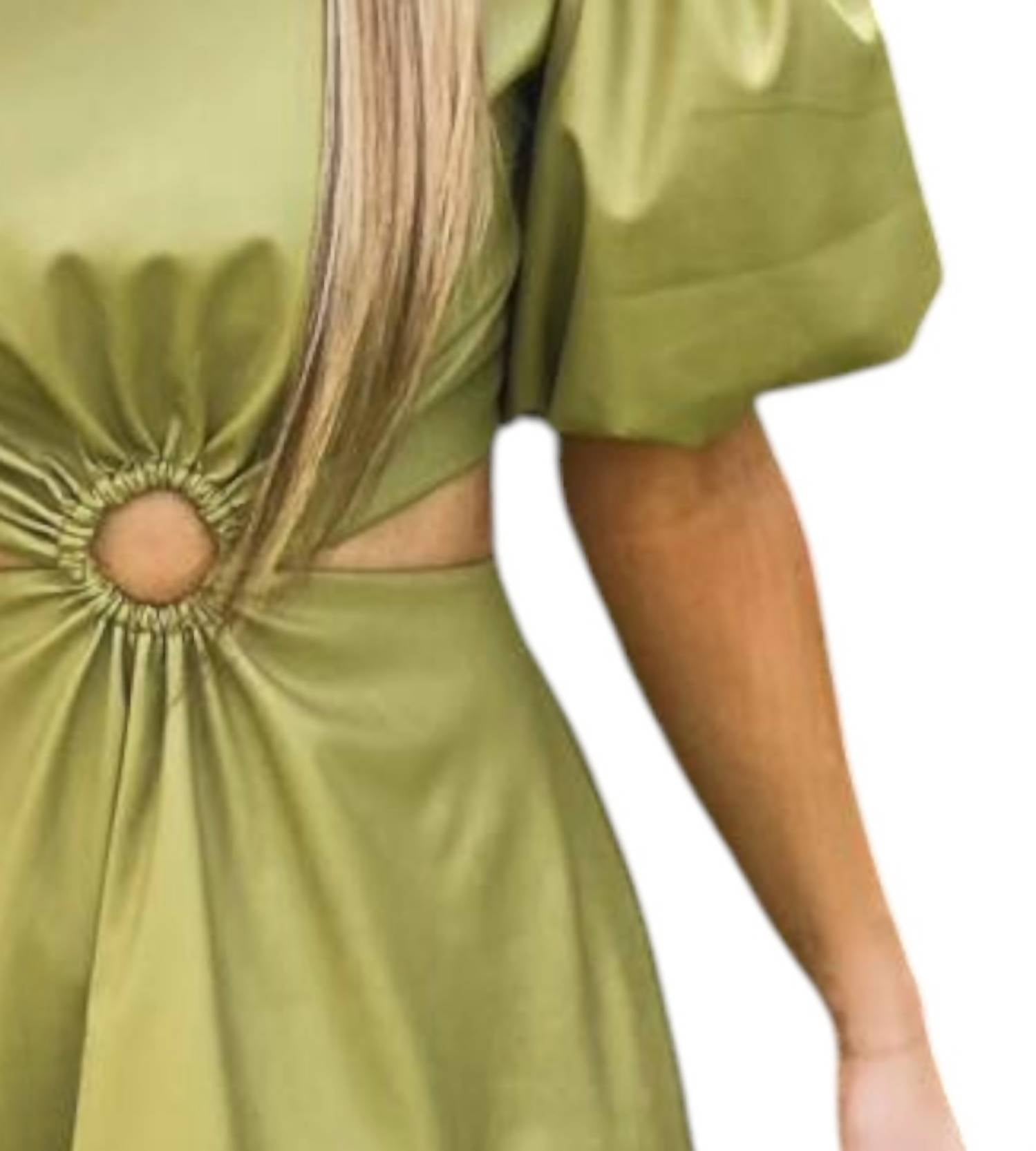 Step up your holiday party look with the Puff Sleeve Mini Dress by Aureum in an elegant olive green. This sheath silhouette features playful short sleeves and a classic crewneck, offering a chic and understated elegance. Designed for summer festivities, this dress is a solid wardrobe staple for any stylish occasion. Care for it with a gentle hand wash for lasting beauty.
