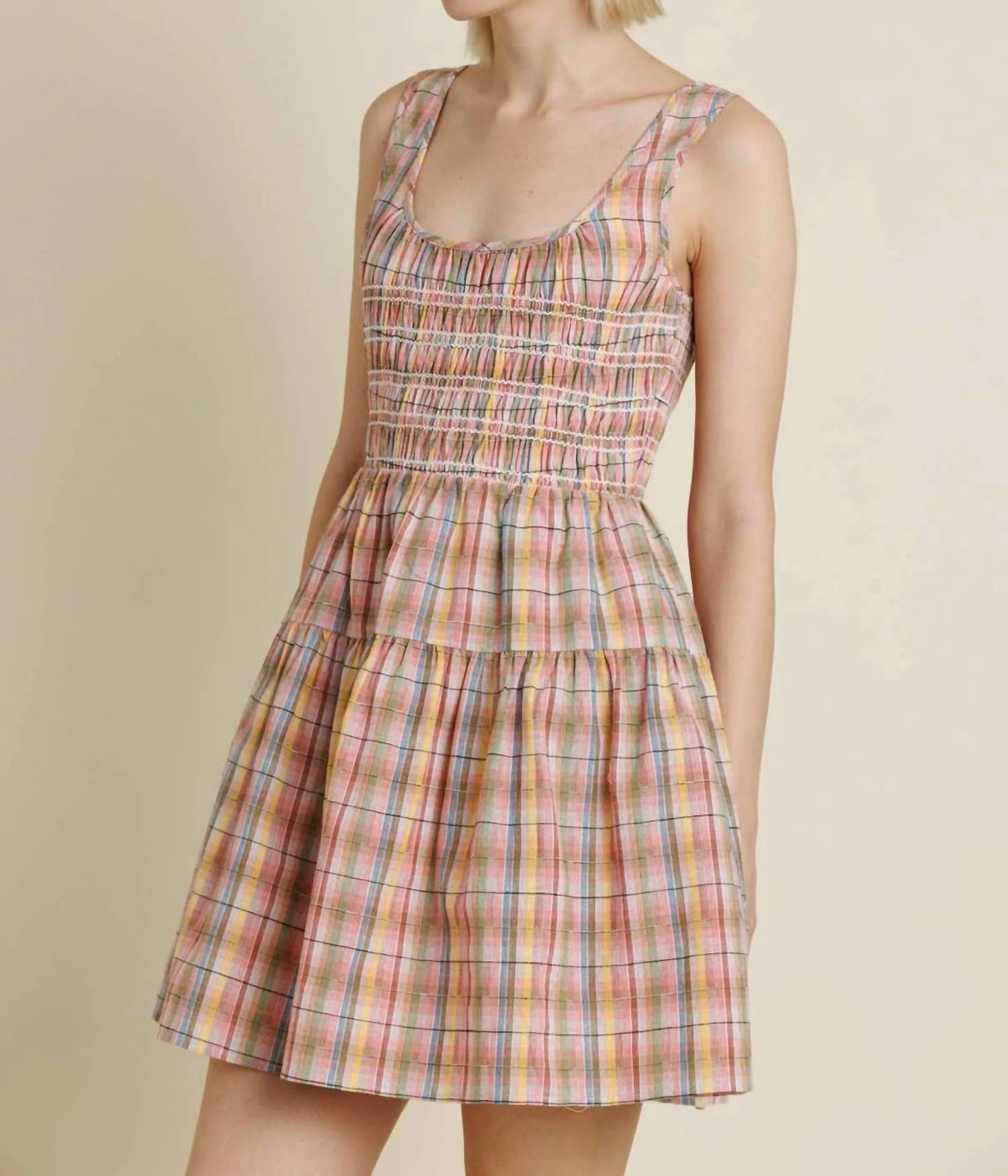The kind of easy and flattering dress you'll be reaching for all season long. Upgrade your wardrobe with the Arum Multicolor Smocked Plaid Mini Dress by Aureum, a must-have statement piece. This sleeveless dress in vibrant plaid features a flattering smocked bodice for a perfect fit. Made from cotton, it includes convenient pockets and a zip closure for easy wear. An A-line silhouette with a scoop neck offers boho chic vibes, perfect for the spring season and Easter occasions.