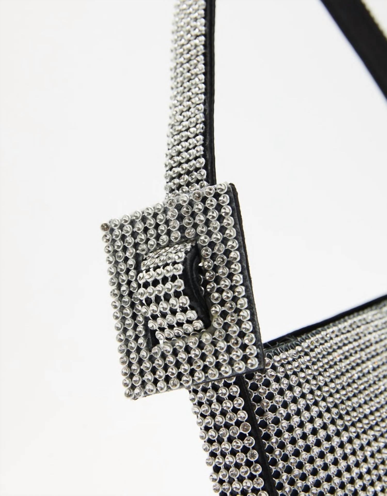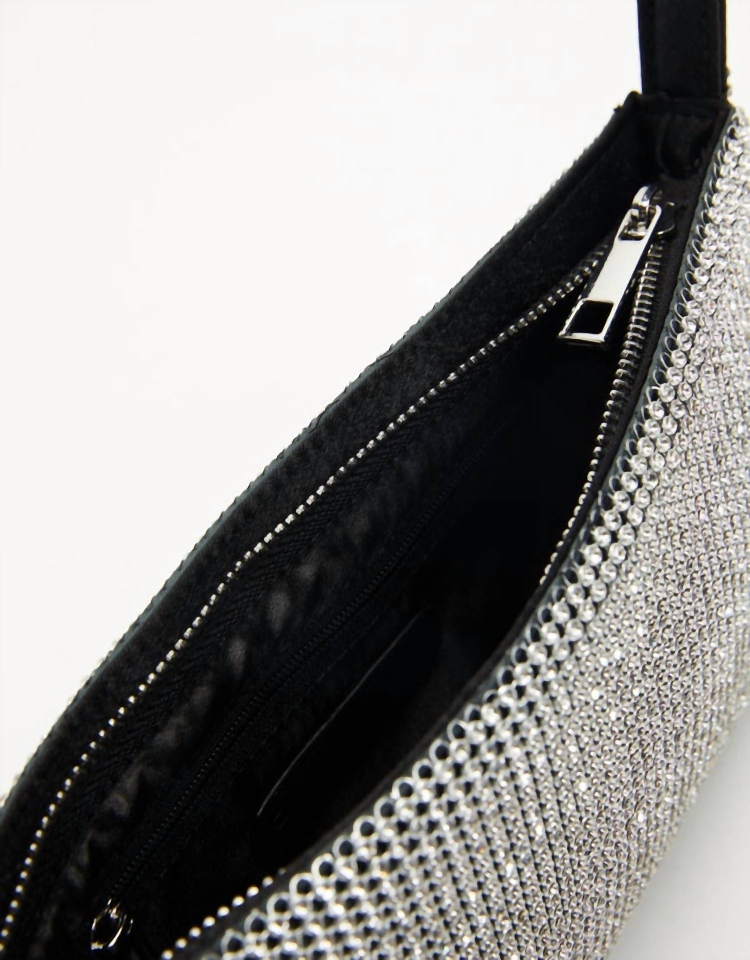 Introducing the Kiz Shoulder Evening Bag by Billini, a chic accessory designed to elevate any outfit. This semi-structured, flat rectangular bag in Silver Diamante boasts a top zip opening with silver hardware and an adjustable shoulder strap encrusted with diamante crystals. Featuring a silky satin interior with two compartments, including a zip pouch, this bag is as functional as it is glamorous. Dimensions: 4.72" height x 9.44" length. For longevity, avoid contact with jewelry, sharp objects, and rough surfaces.