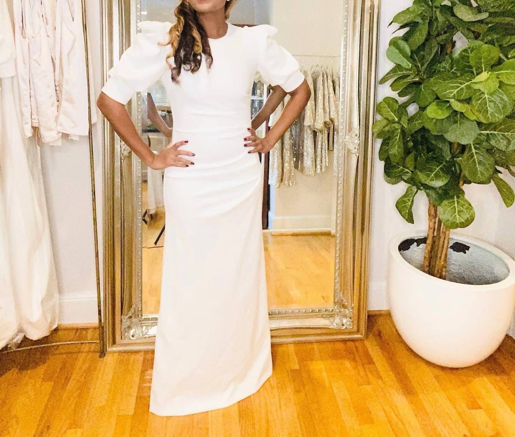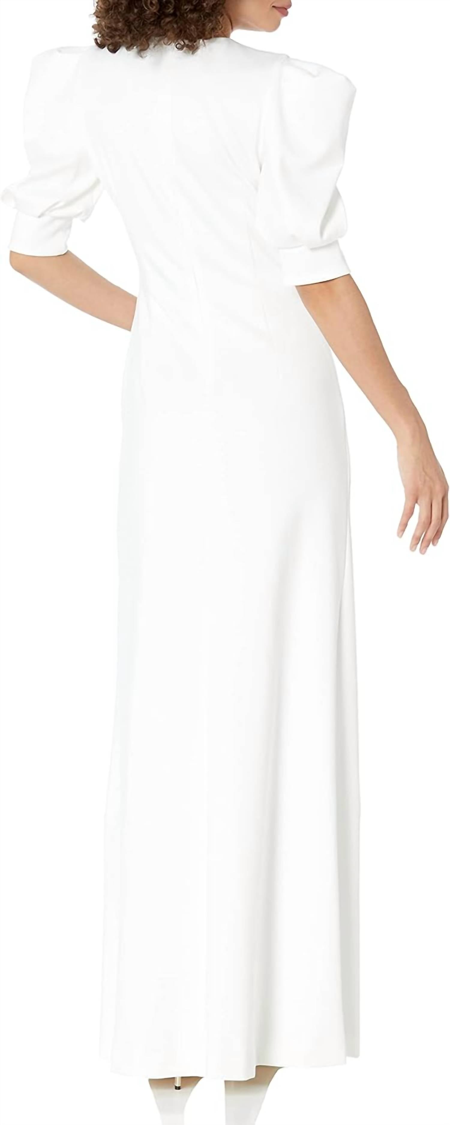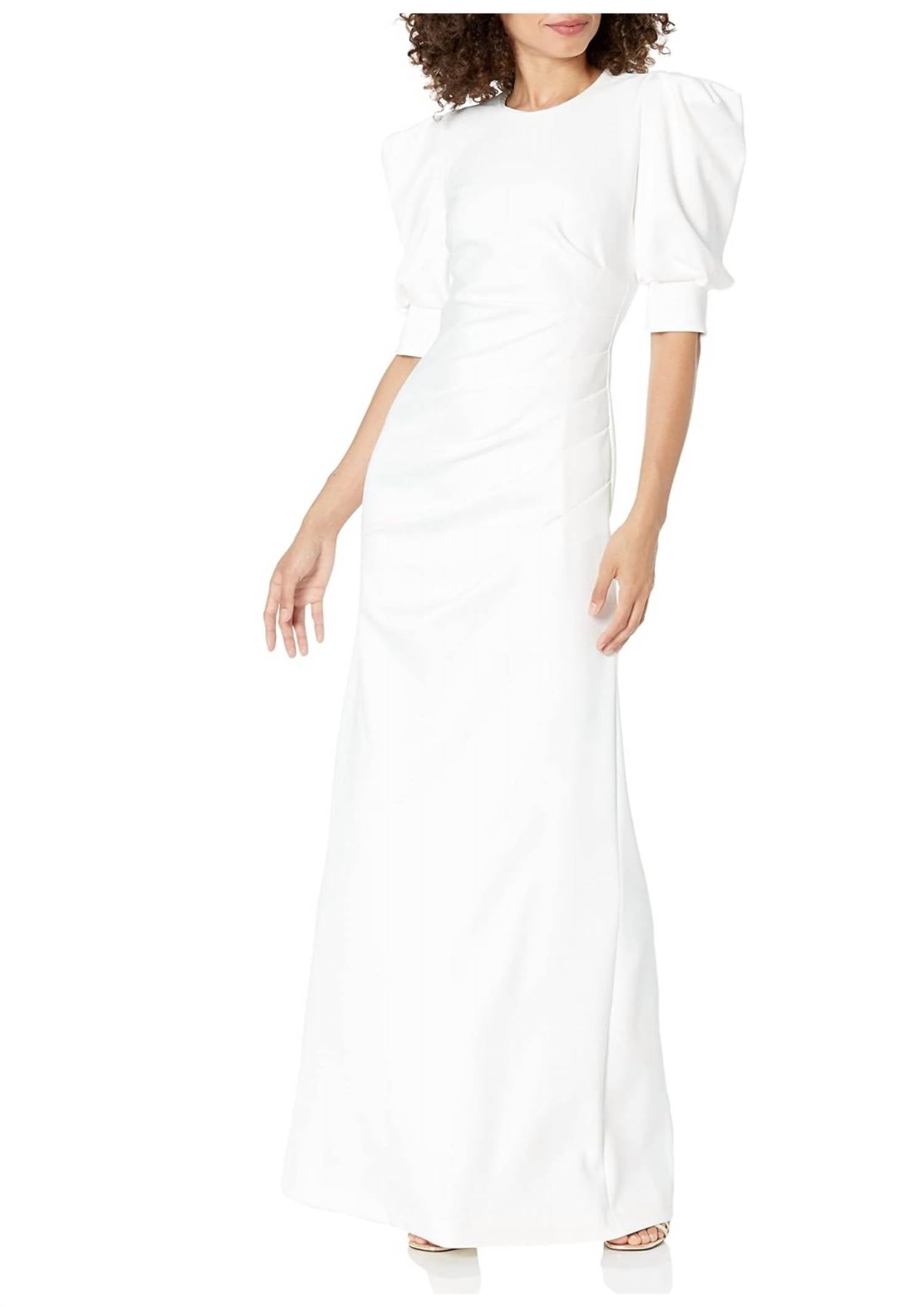 A maxi dress that is just as cute as it is comfortable. Introducing the Black Halo Puff Sleeve Maxi Dress in a sophisticated Creme hue, perfect for elegant events and formal occasions. This women's dress features elbow sleeves with ruched side detailing and a mermaid silhouette, exuding an air of quiet luxury. Closure: Zip closure. Care: Dry clean only.
