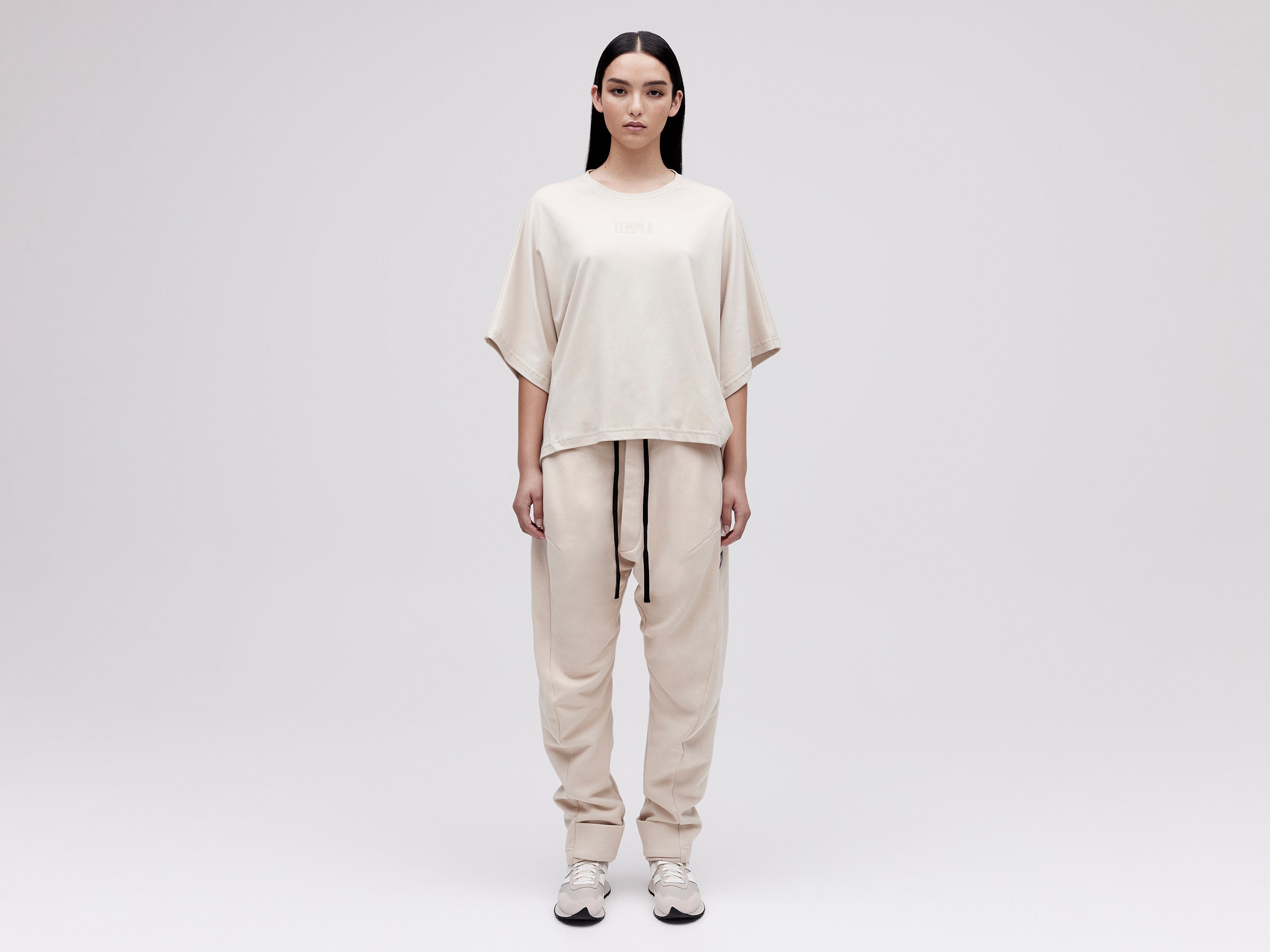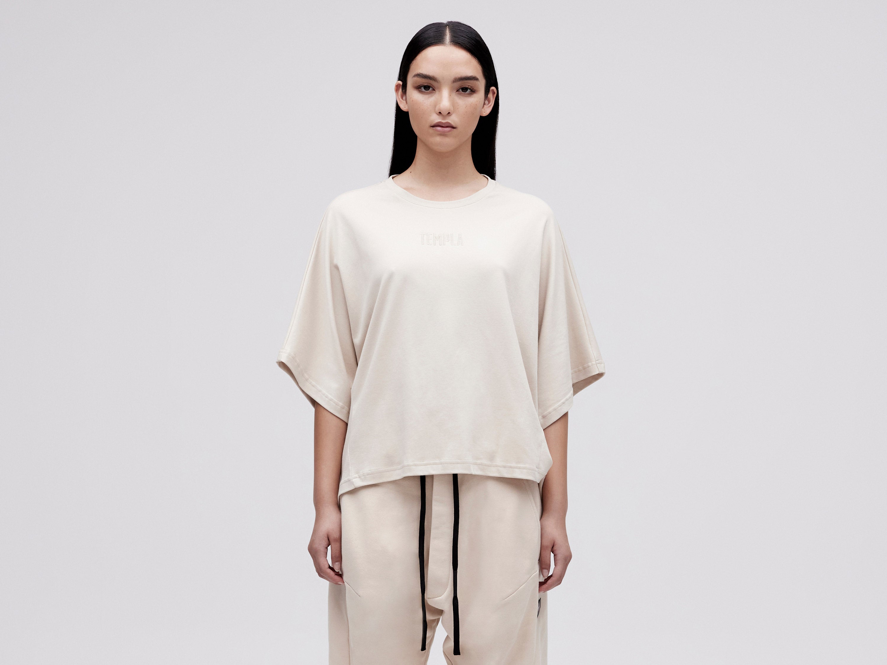 With a simple yet feminine design, our Cropped Tee combines fluid dropped sleeves, with a high/low hemline accentuating the neat front with the draped volume in the back. This effortless crew neck t-shirt is an easy-fit essential crafted from luxurious organic cotton. Our tonal 'TEMPLA' logo embroidery on the chest is a minimal statement of subtle sophistication.