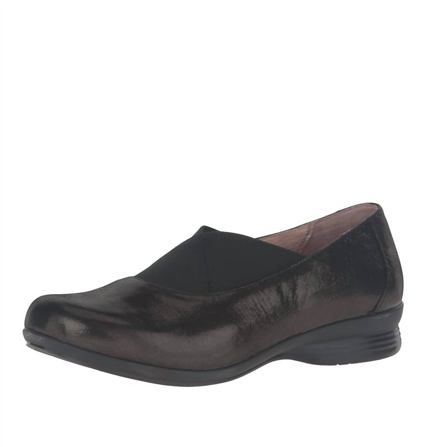 The Ann Slip On by Dansko is a chic addition to any wardrobe, featuring a round toe and flat heel that's perfect for casual outings. Crafted from 100% leather, this flat showcases a unique black metallic suede design with a solid black gore inset for added comfort and unexpected style. The shoe includes a removable, contoured PU footbed with memory foam at the heel seat, offering cushioning and arch support, and is complemented by an integrated insole for stability. It also features a durable TPU outsole and leather linings for all-day comfort, making it an excellent choice for versatile wear.