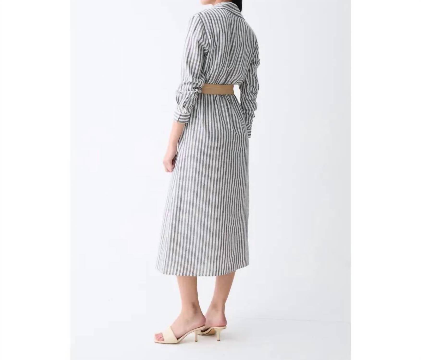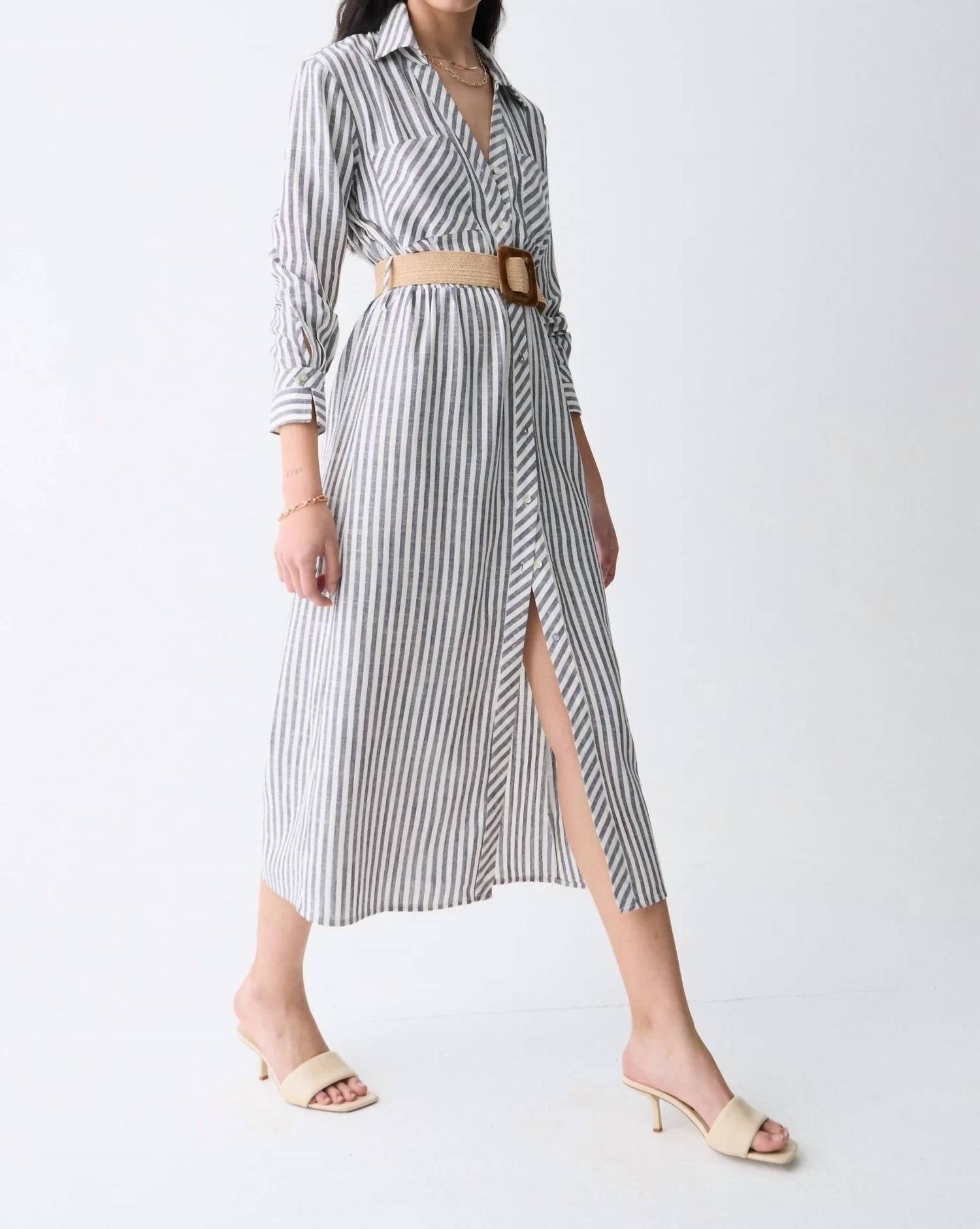 A maxi dress that is just as cute as it is comfortable. Discover the Marialva Maxi Shirt Dress by DELUC in Striped Blue, a harmonious blend of 55% Linen and 45% Cotton. This maxi-length dress features long sleeves with buttoned cuffs, a stylish lapel collar, and a versatile shirt silhouette, complete with chest pockets for added functionality. Designed with a front button closure and a detachable elasticized belt, it offers a relaxed fit perfect for spring workwear occasions. For care, machine wash and line dry to keep it in pristine condition.