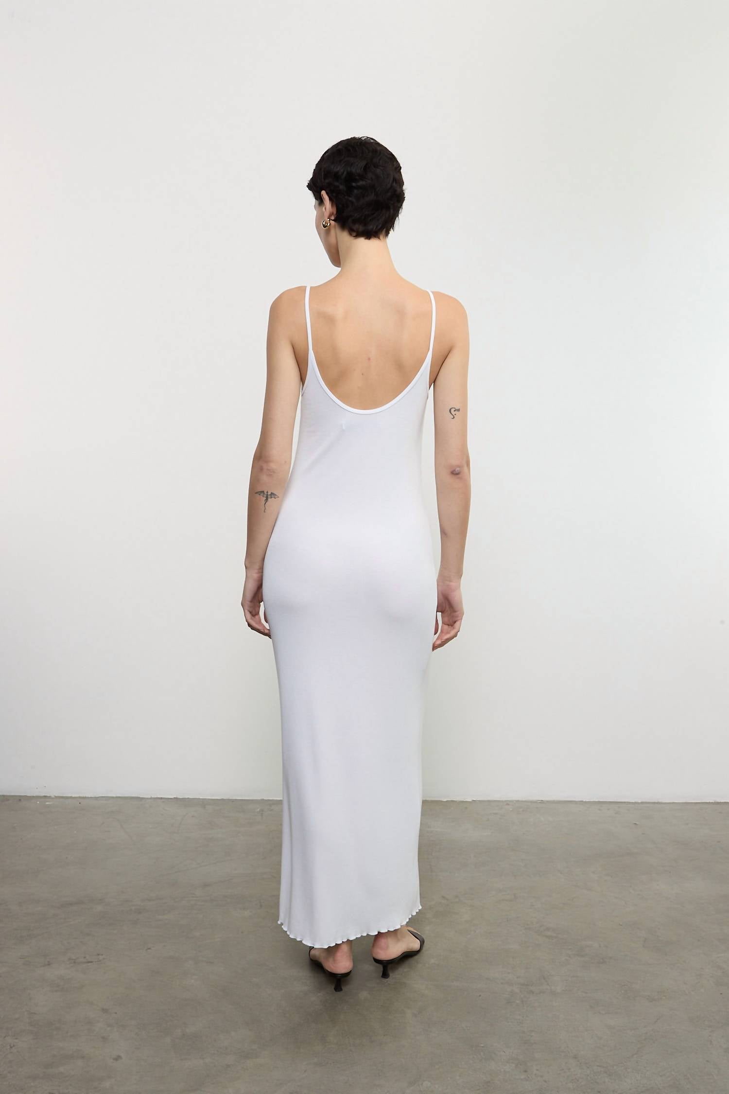 The perfect length dress does exist. A soft silk rib dress with thin straps, deep u back design, and a lettuce edge hem.