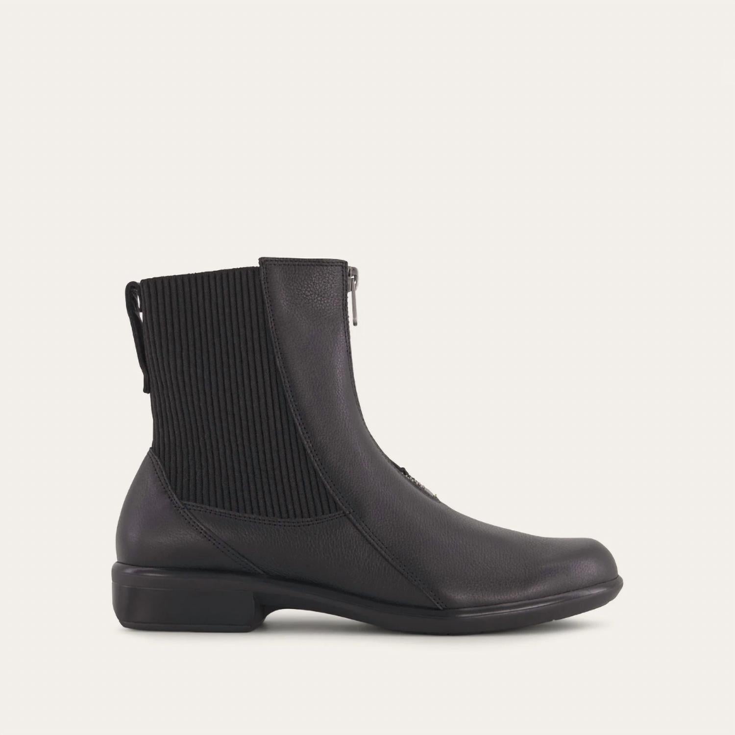 Say hello to the perfect, most versatile boot. The ankle height makes this style easily transition from day to night. Wear them with your favorite skinny jeans and tee for a more laid back look, or pair them with your favorite mini dress and jacket for a night out on the town. The Women's Bora Boot by NAOT seamlessly blends modernity and practicality with its sleek black leather silhouette and almond toe shape. Featuring a front zipper and stretchy panels, this ankle boot offers a customizable fit with a chic block heel designed at 1.5 inches. It's crafted for effortless elegance and durability, making it perfect for the fall season and vacation wardrobe. Style meets comfort with a removable cork and latex footbed, suitable for women seeking both sophistication and comfort in their footwear.