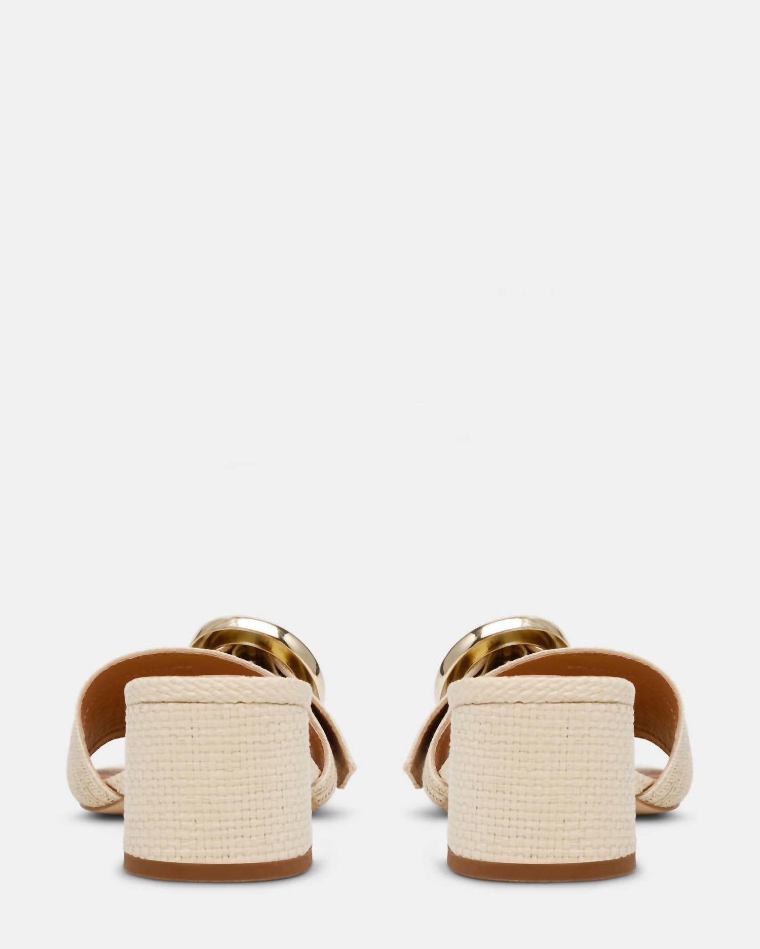 Flowy dresses, cropped pants, and even jumpsuits... this sandal works with them all! Step into sophistication with the Women's Seacrest Sandal by Steve Madden, a staple in minimalist summer fashion. This natural raffia mule heel brings elegance with an open square-toe design complemented by a chic buckle ornament detail. Made with a synthetic raffia upper, lining, sock, and sole, it stands out with its 2-inch block heel, perfectly balancing style and comfort. Imported to guarantee quality, this sandal is ideal for any occasion, from Thanksgiving dinners to elegant outings.