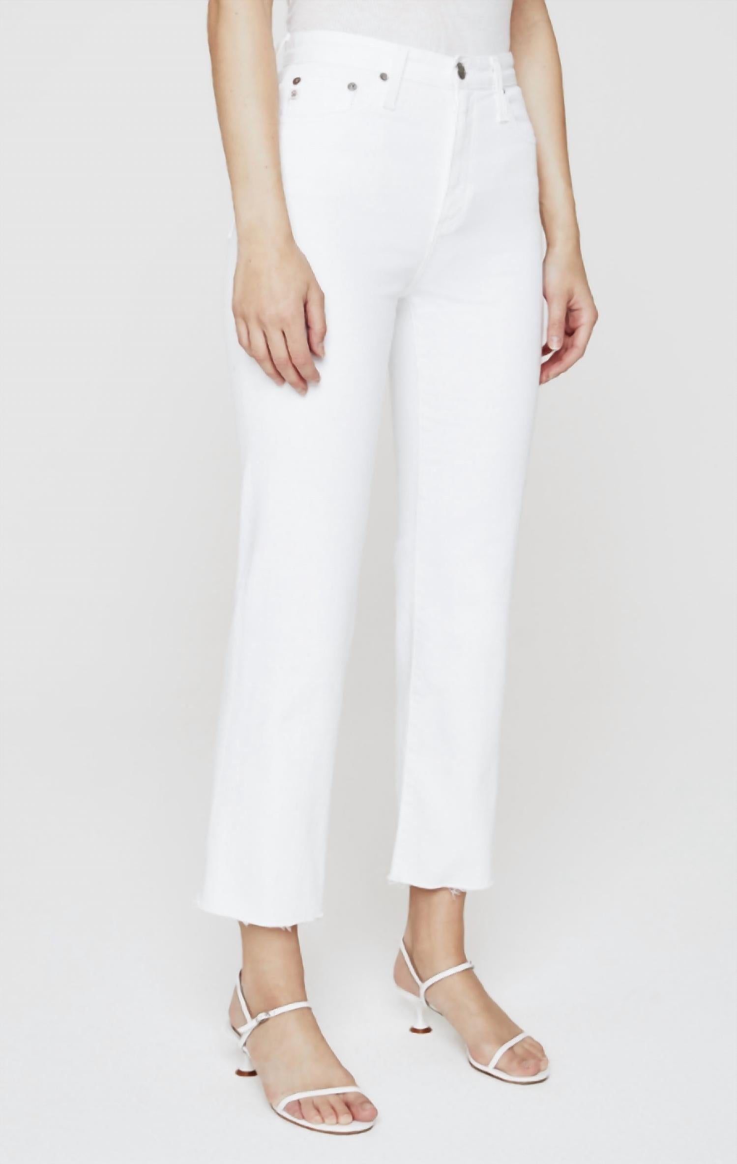 Experience effortless style with the Alexxis Cropped High Rise Jeans by AG Jeans, tailored for the modern minimalist. Featuring a crop length and a flattering high waist, these slim fit pants boast a 10.75" front rise and a 33" inseam, with a leg opening of 18.75". Crafted from a cotton blend comprising 98% cotton and 2% spandex, they offer a comfortable straight leg silhouette with a button closure. Perfect for summer vacations, these jeans are machine washable and can be tumble dried.