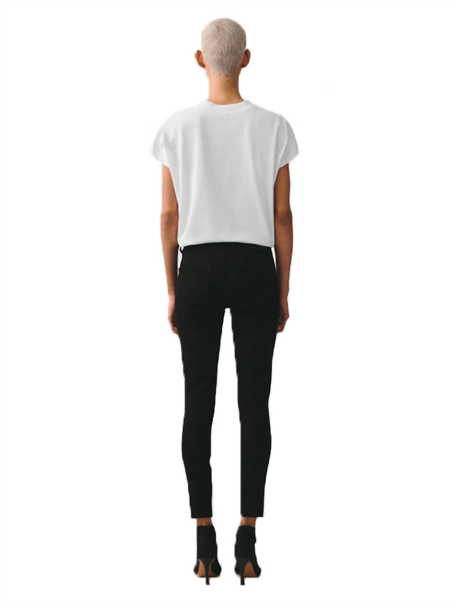 Agoldestimeless and super flattering hi rise skinny meant to curve and elongate the legs in a clean black denim