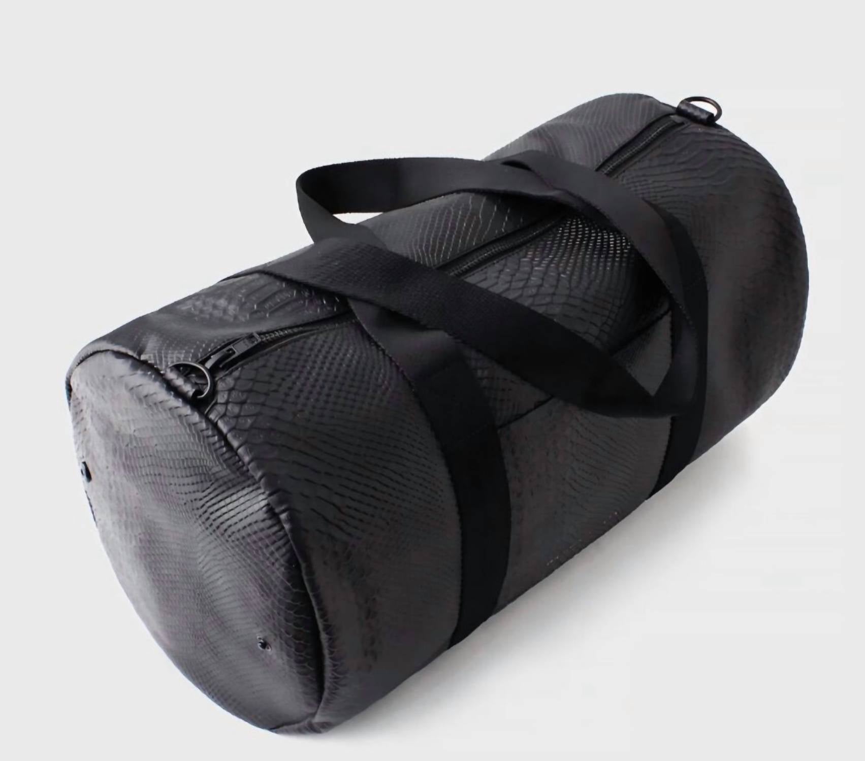The Unisex O.G. Convertible Duffle Bag by AMPERSAND AS APOSTROPHE merges style and functionality for your travel needs. Crafted from high-quality leather material in sleek black, this bag features a front exterior pocket with a custom "bolt" snap closure and signature gold foil-stamped logo. It offers a lined interior with two pockets spacious enough for shoes, twin top handle straps, and a detachable, adjustable shoulder strap. Enjoy added practicality with its matte black metal zipper, hardware, and included dustbag, all in a versatile size of approximately 18” L x 11” W x 11” H.