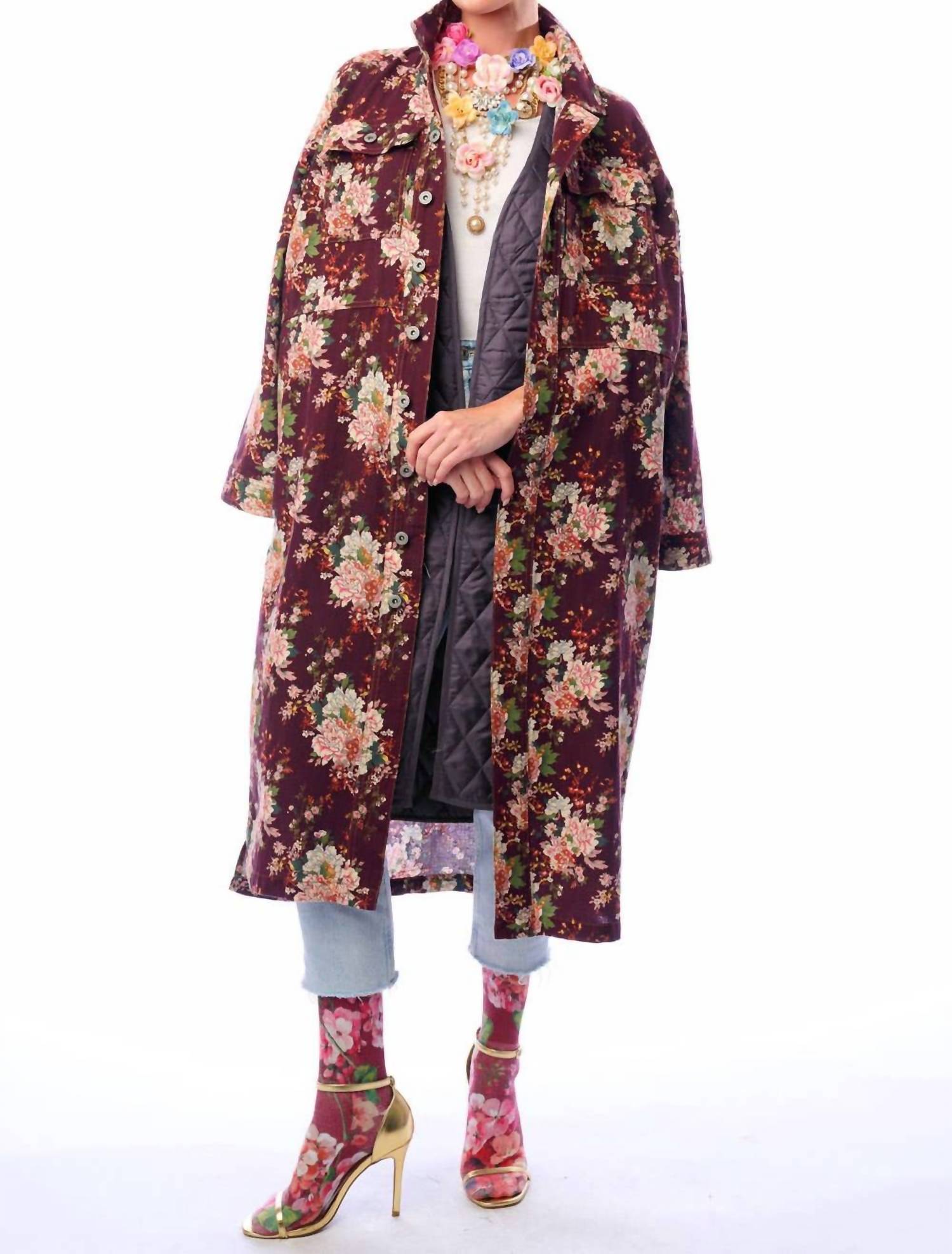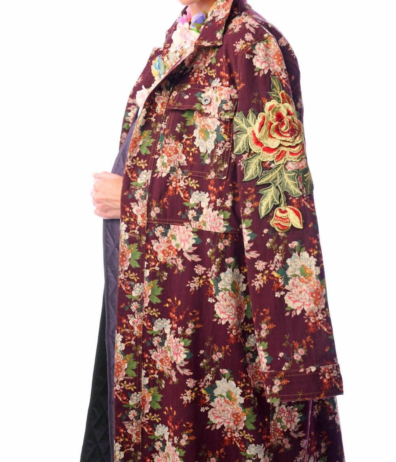 An elevated version of your favorite classic blazer. Introducing the Cara Delvinge Floral Coat by Aratta, a delightful blend of elegance and charm in burgundy. This cotton-linen blend coat features long sleeves, a floral print with an embroidered patch on the sleeve, and a slight high-low hem for a flattering silhouette. It comes from India and is designed with a button-up closure, detachable quilted liner, and practical front pockets for added convenience. Care for your coat with a warm hand wash alongside similar colors to maintain its vibrant appearance.