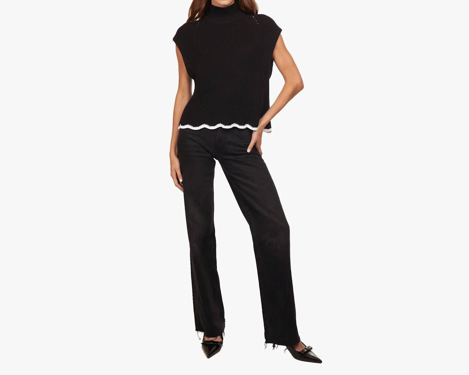 Introducing the Scallop Edge Shaker Top by Autumn Cashmere, a sophisticated monochrome piece in Black/Bleach White. This women's tank top features cap sleeves and a mockneck design, offering a textured Italian cotton composition. Enjoy the effortless style with a pull-on closure and a unique contrast scalloped hem. For care, hand wash and lay flat to dry to maintain its elegance, perfect for summer vacations or Mother's Day occasions.