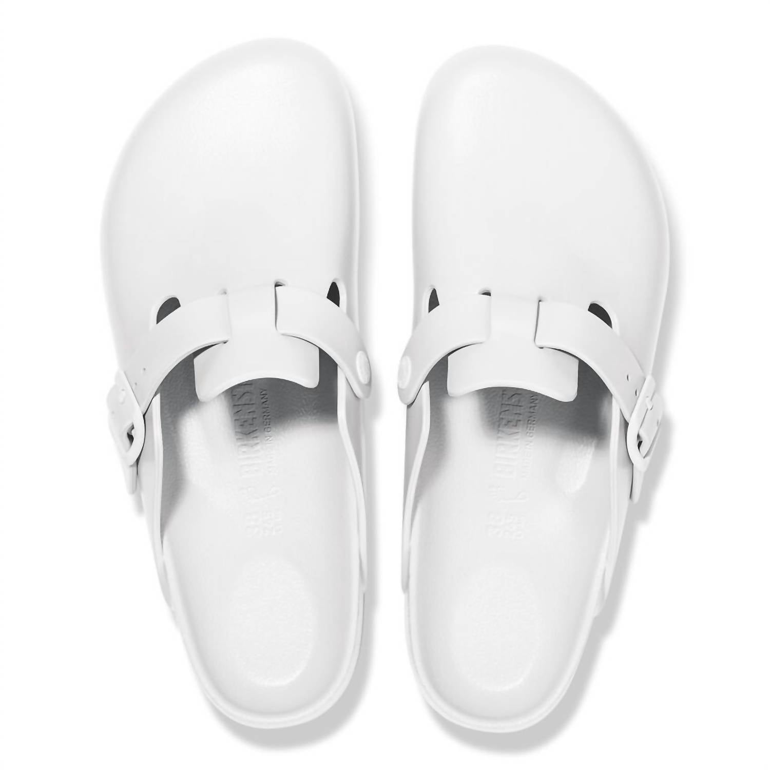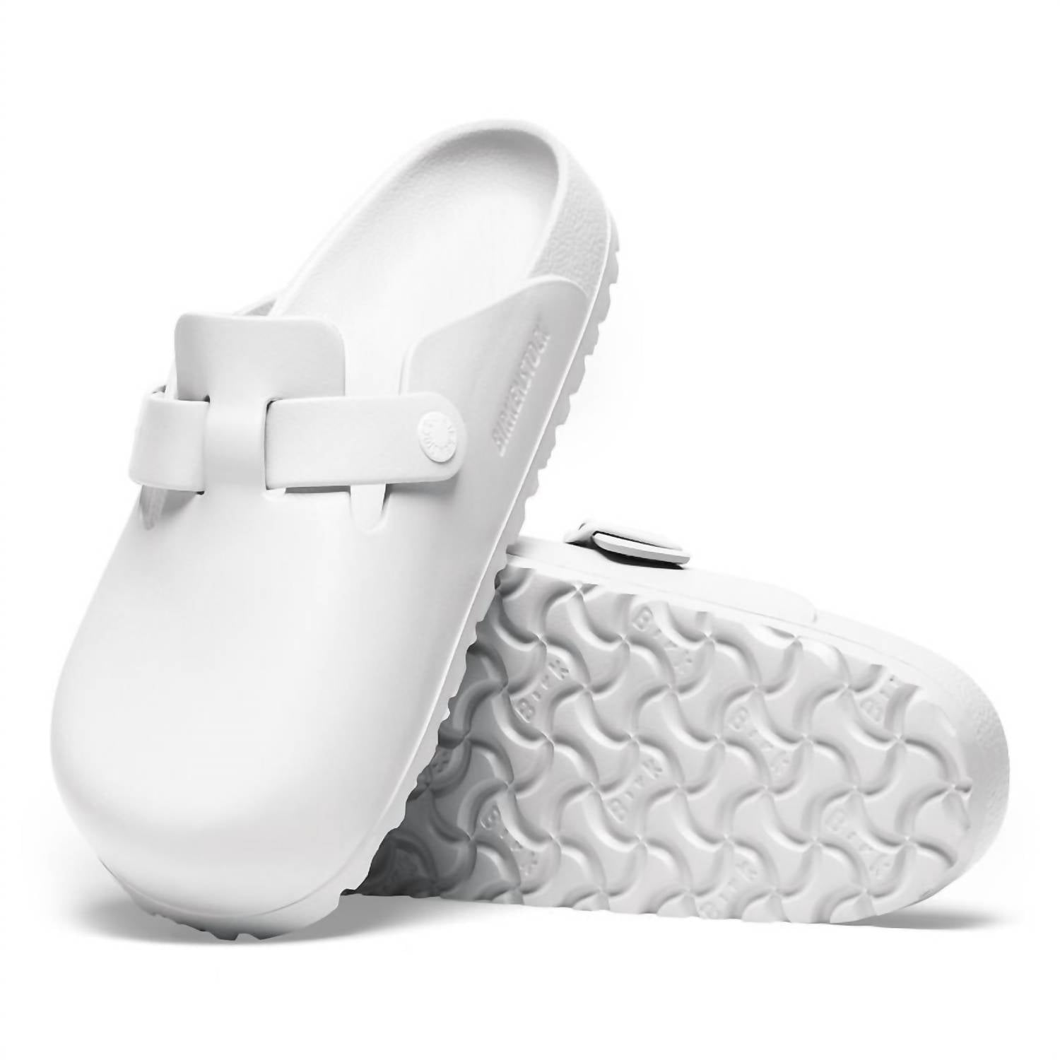 Step into comfort with the Women's Boston Eva Mules by BIRKENSTOCK, a timeless piece perfect for year-round wear in classic white. Made in Germany, this mule features an anatomically shaped footbed crafted entirely from lightweight, flexible, and waterproof EVA material. Designed for durability and easy maintenance, the upper, lining, and sole are seamlessly constructed as a single piece of EVA. Ideal for women seeking both style and comfort, these mules are skin-friendly and shock-absorbent.