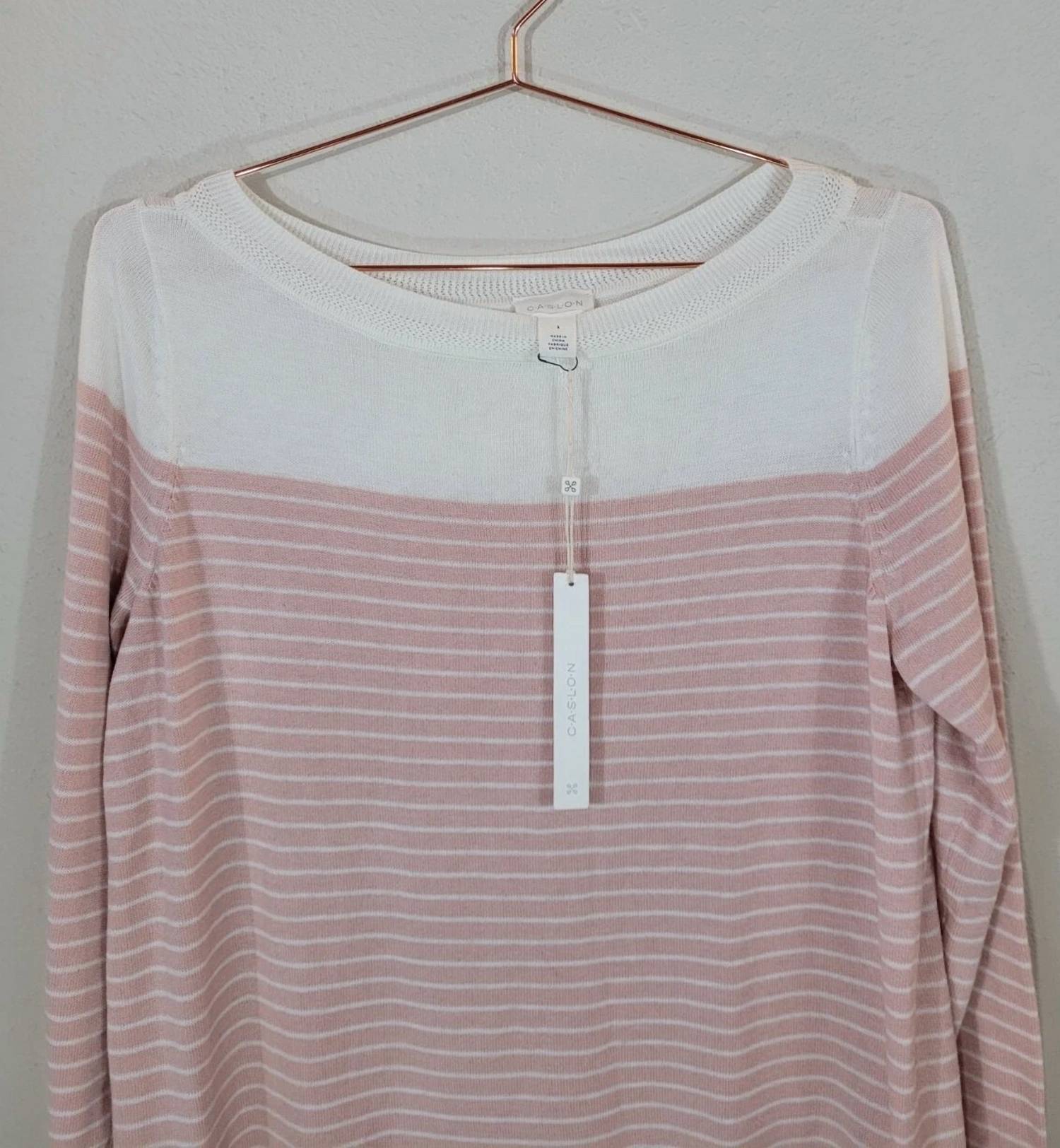 Experience the perfect blend of comfort and style with this trendy crew neck sweater, designed to effortlessly elevate your wardrobe. Pair it with your favorite denim and loafers for the perfect look. Introducing the Women's Colorblock Knit Sweater by Caslon, a perfect choice for preppy spring travels in chic pink placed stripe. This sweater features long sleeves with a boatneck design, complemented by ribbed cuffs and hem for added style. Crafted from a lightweight viscose blend of 40% Viscose, 30% Nylon, 25% Recycled Polyester, and 5% Wool, it offers a comfortable tunic length of 28 inches. Closure: Pull-on. Care: Hand wash cold, lay flat to dry.