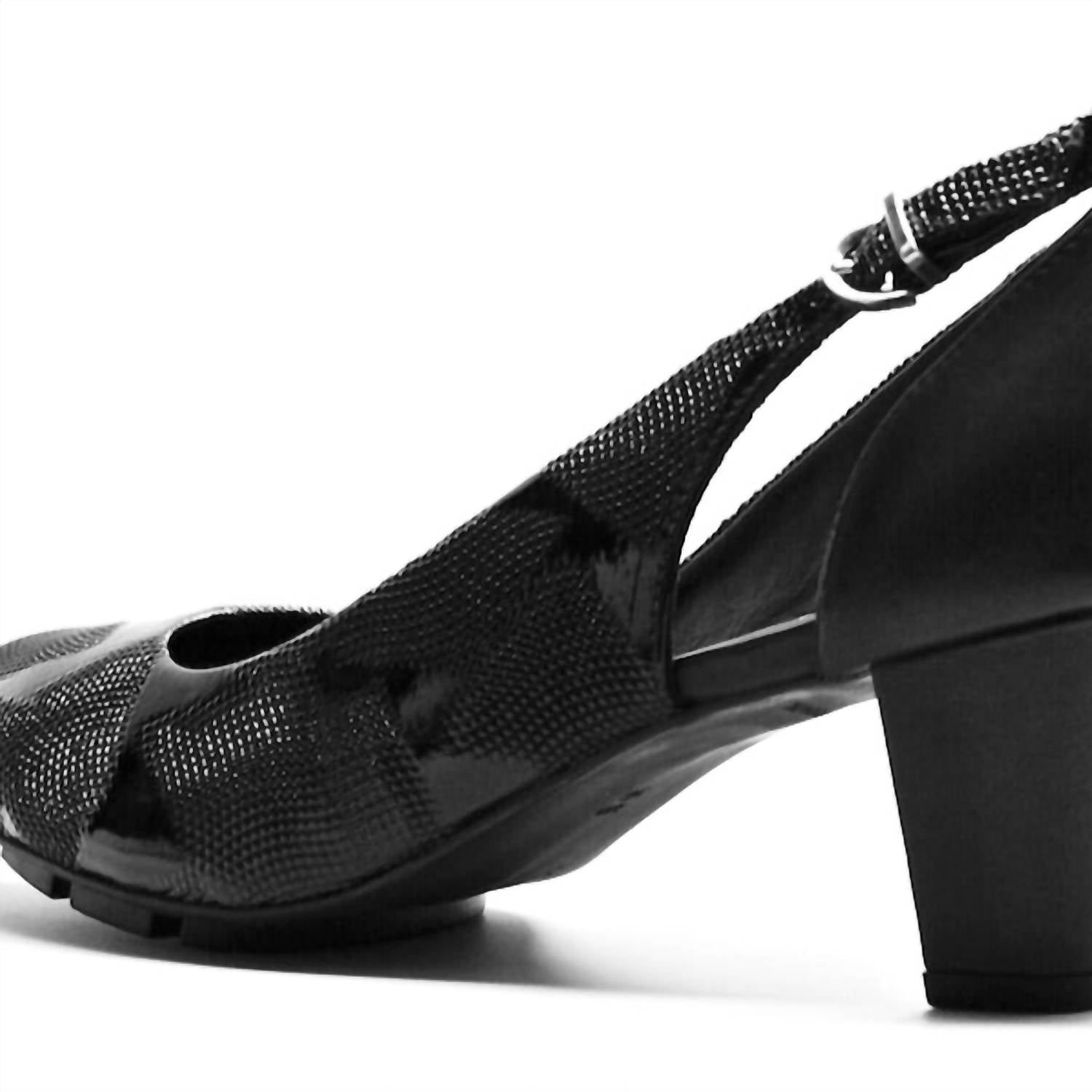 The Women's Slim Mid Heels by Chelsea Jones offer a perfect blend of style and comfort for your next engagement or summer occasion. Crafted from a leather upper, these black patent heels feature a 2 1/4” block heel height and an almond toe shape. Designed in the 'Quiet Luxury' trend, they ensure an adjustable fit with a side buckle and an ultra-cushioned, lightweight feel, thanks to the 5mm flexible rubber sole and foam cushioning with pocketed stitching. Made in Brazil, these heels promise uncompromising comfort and flexibility for luxurious wear.