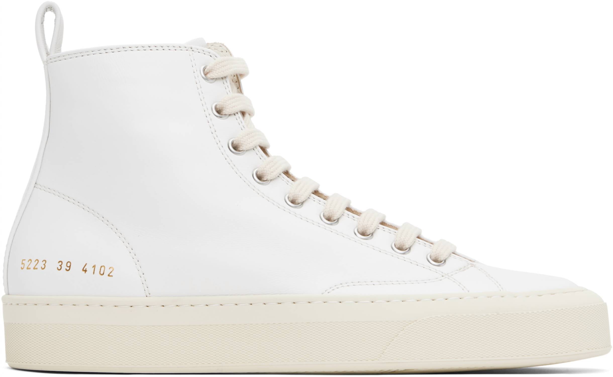 When fashion and function come together seamlessly. Step up your streetwear game with the Women's Tournament High In Leather Sneakers by Common Projects. Crafted in off-white, these sneakers feature a stylish round toe and a flat heel under 1 inch, perfect for a laid-back spring vacation. Designed for women, they blend effortlessly into any casual wardrobe while delivering comfort and chic appeal. A must-have for the trendy yet understated look.