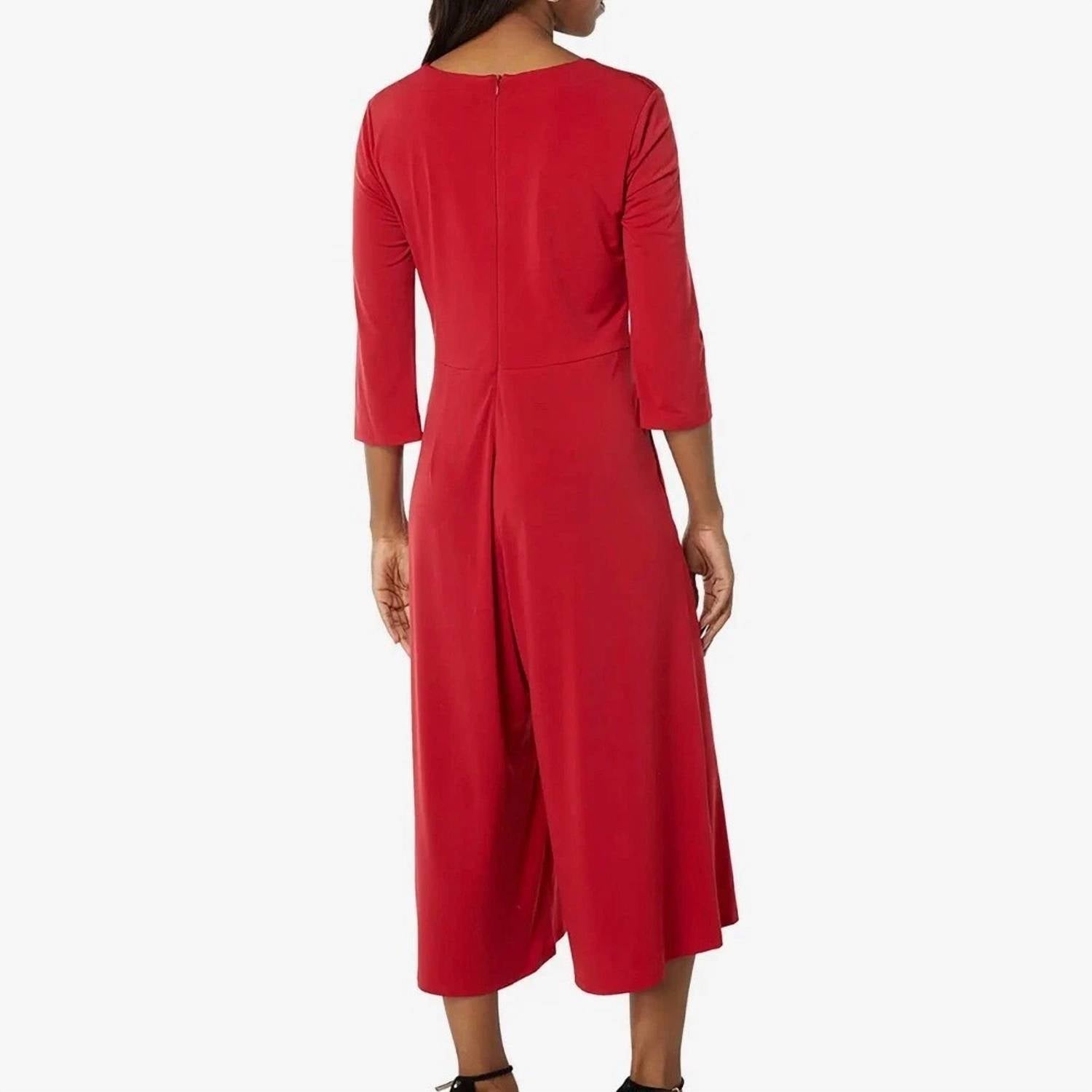 Throw it on and go! Introducing the Erys Jumpsuit by LONDON TIMES, a chic addition to your spring wardrobe in a vibrant red. Crafted from 95% polyester and 5% spandex, this jumpsuit offers a flattering v-neck and smocked bodice details. The wide leg design, complemented by the practicality of pockets, makes it both fashionable and functional. Zip closure. Machine wash and tumble dry.