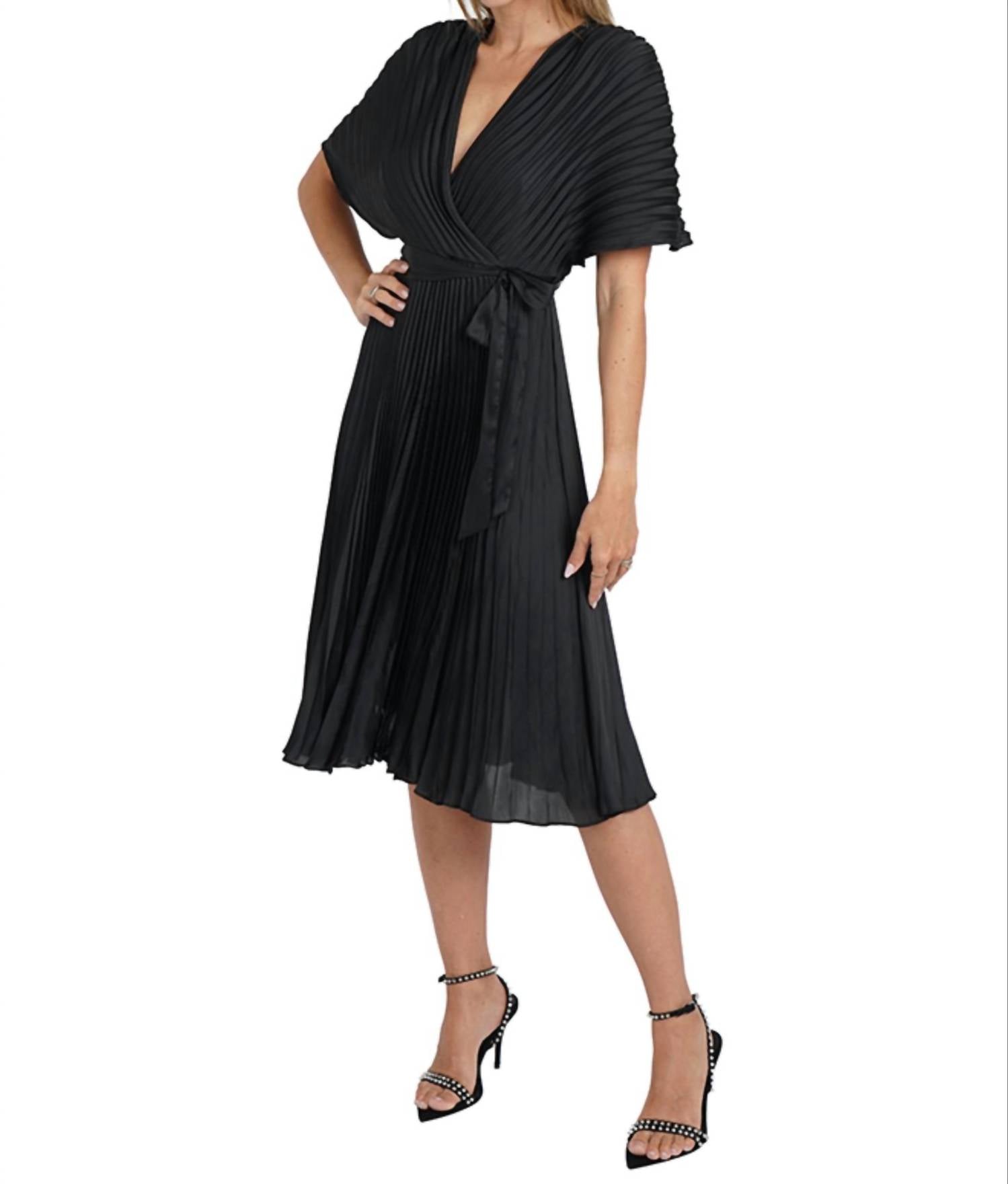 Just add slides or mules and you are good to go. Introducing the Deanna Pleated Dress by Love Token, crafted for timeless elegance and versatile styling. This women's midi dress features short sleeves and a chic V-neck, with a flattering wrap silhouette. Made from 100% polyester, it boasts a luxurious textured black satin look, perfect for minimalist summer trends. The dress includes a zip closure and requires dry cleaning, offering convenience and sophistication for any dinner party.