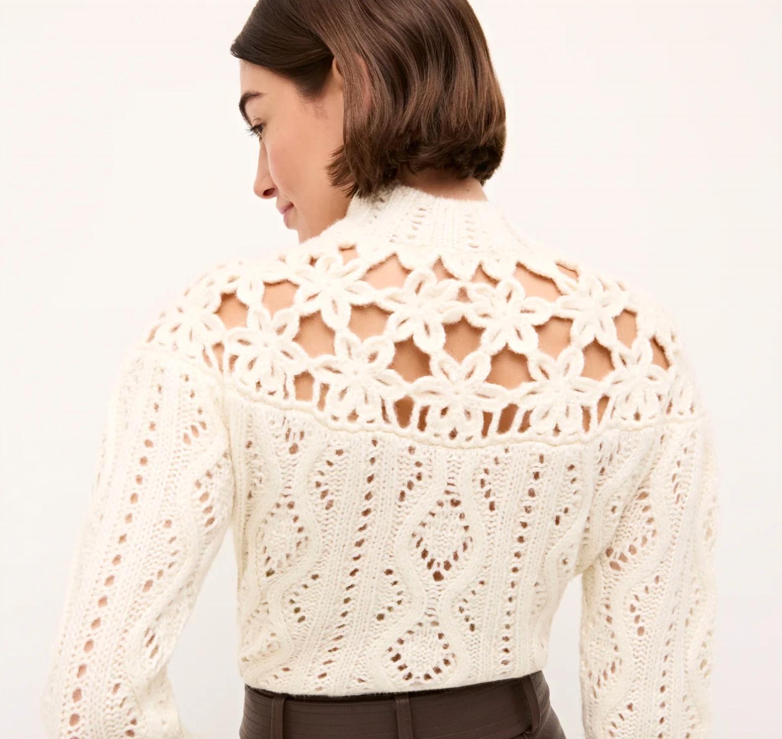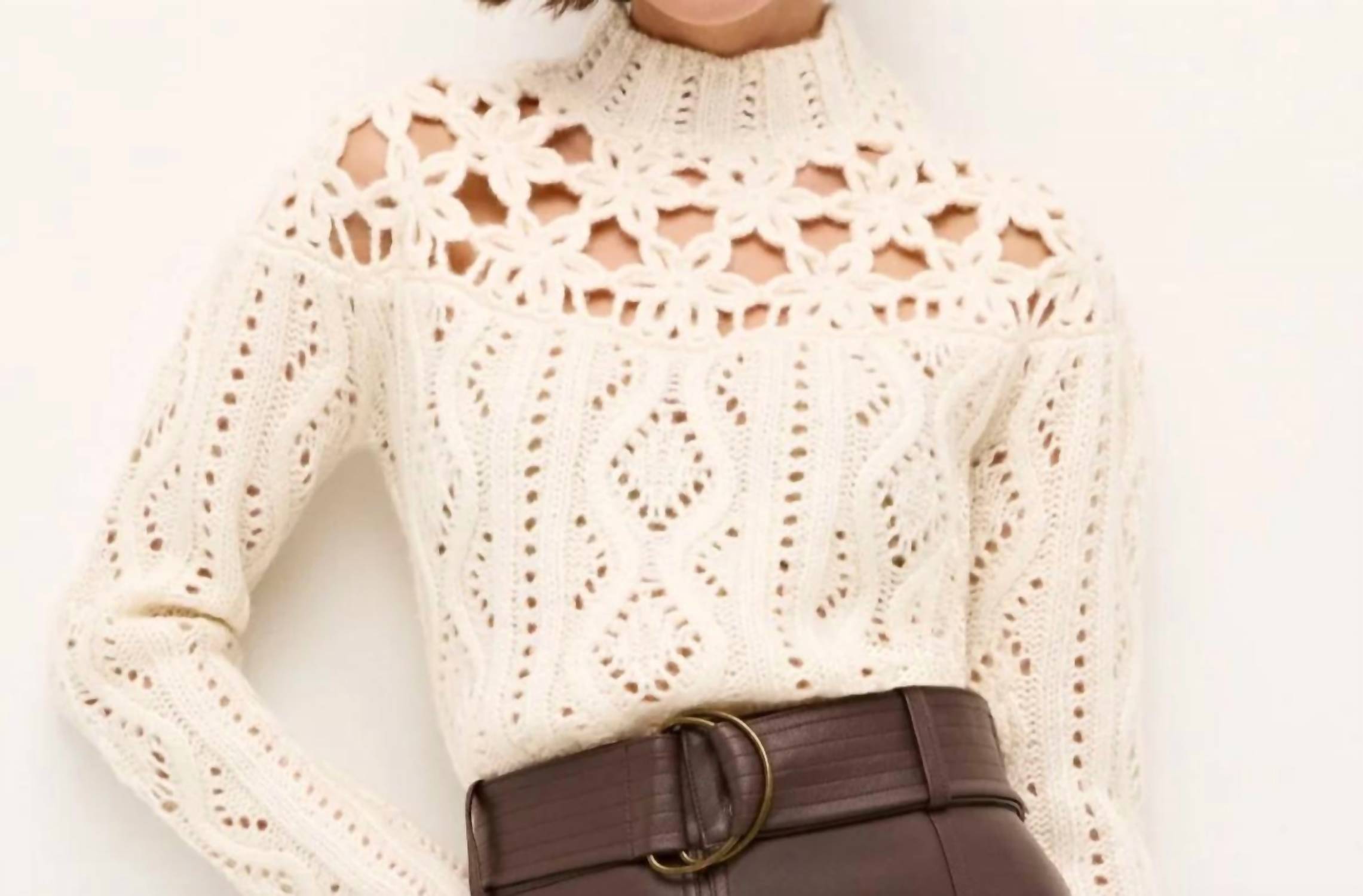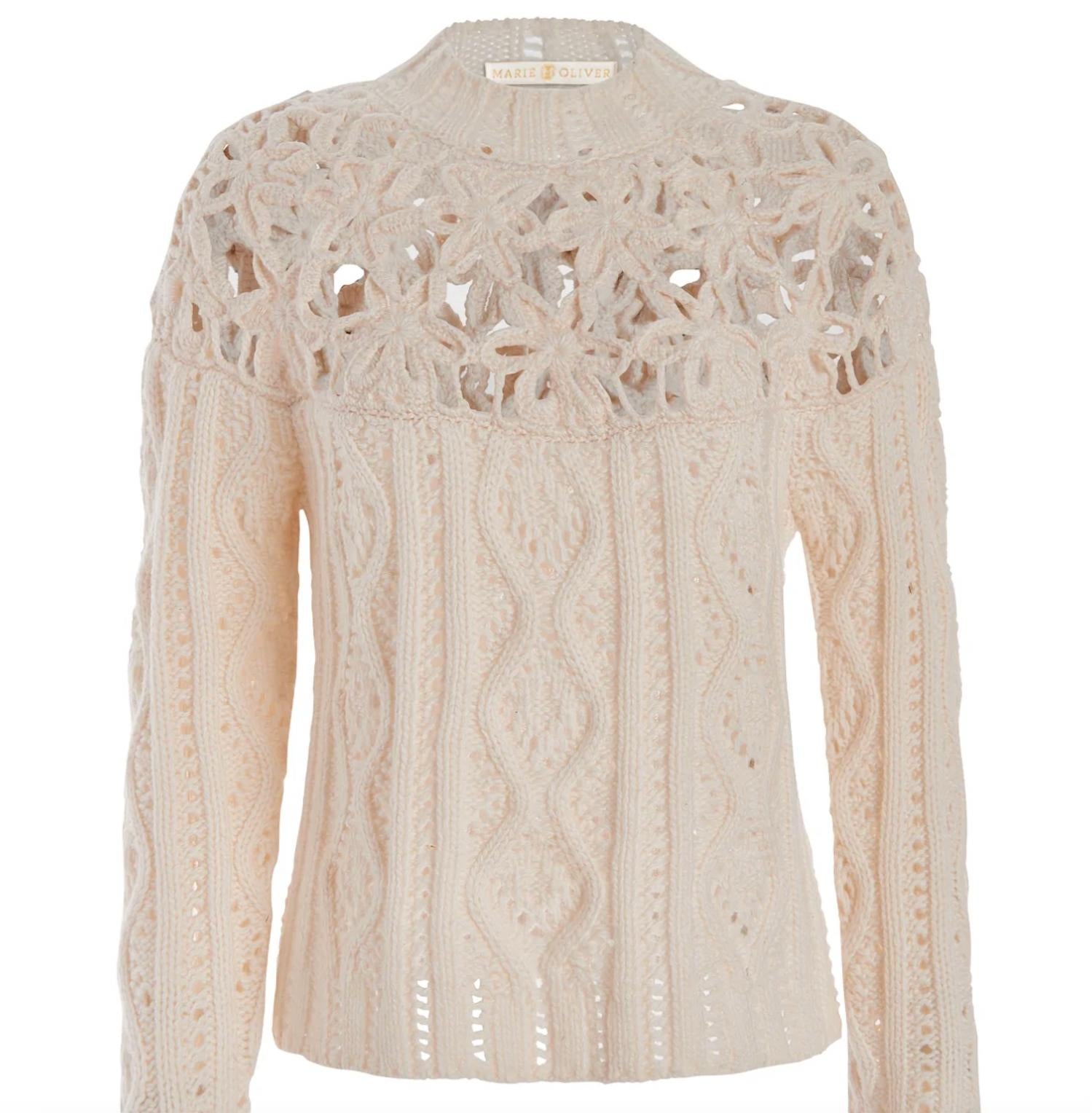 Introducing the Flora Sweater by Marie Oliver, a statement piece for the discerning wardrobe. This winter white sweater boasts long sleeves and a chic open-knit floral yoke, perfect for adding texture and elegance. Crafted from a luxurious wool blend (73% Wool, 27% Poly), this textured garment features cable and rib knit details through the sleeves and body. Designed with a mockneck and pull-on style for effortless sophistication.