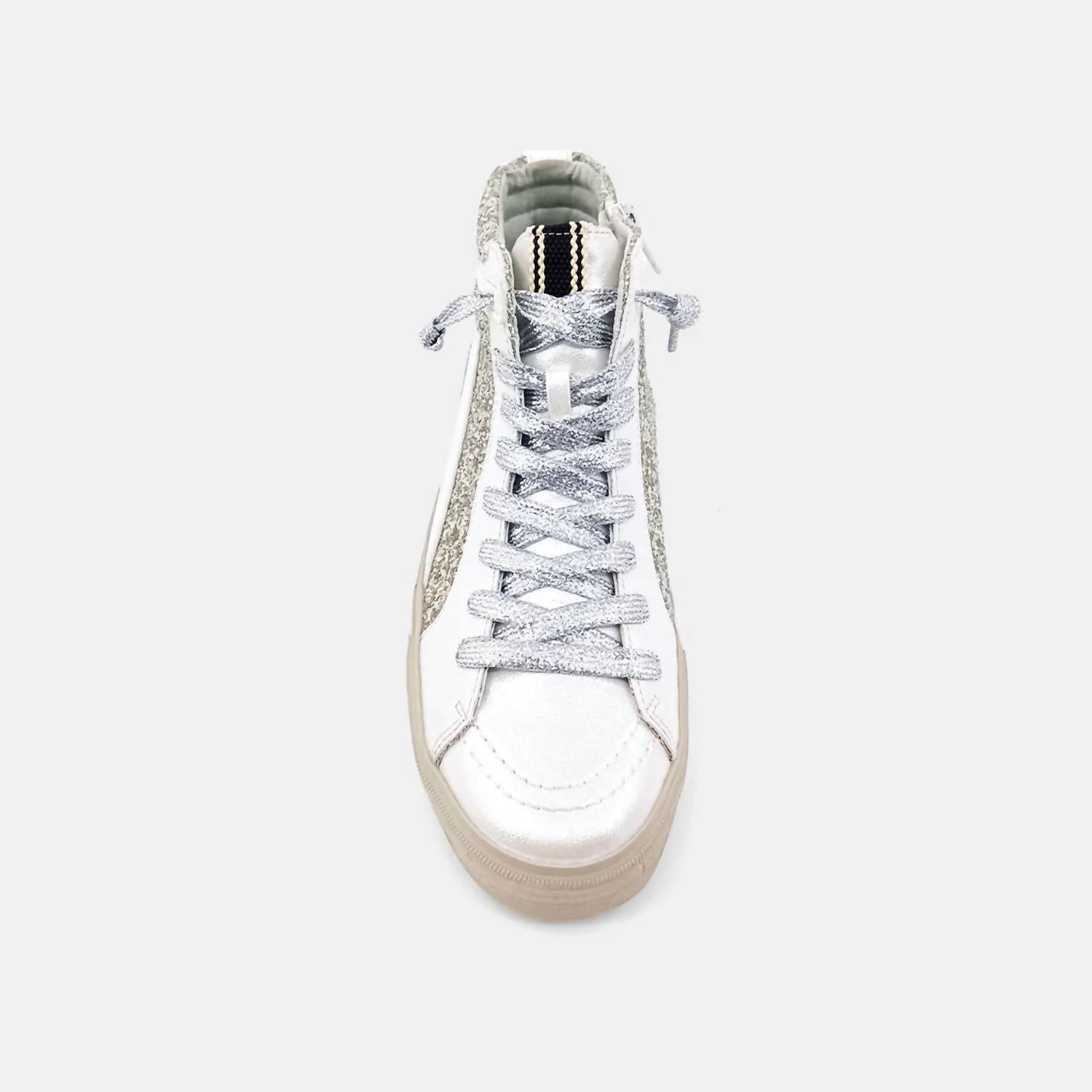 Cute, functional, and comfortable. These sneakers check all the boxes. Step into style with the Women's Rooney High Top Sneaker by SHU SHOP, a standout piece in Pearl Glitter designed for fashion-forward versatility. Crafted from faux leather, these sneakers exude a preppy charm, ideal for any occasion from a holiday party to a casual spring outing. With a classic round toe shape, they pair effortlessly with skirts, track pants, or even tailored pieces. Perfect for adding a touch of sparkle and trendiness to your spring wardrobe, these sneakers are a must-have for New Year's Eve celebrations.