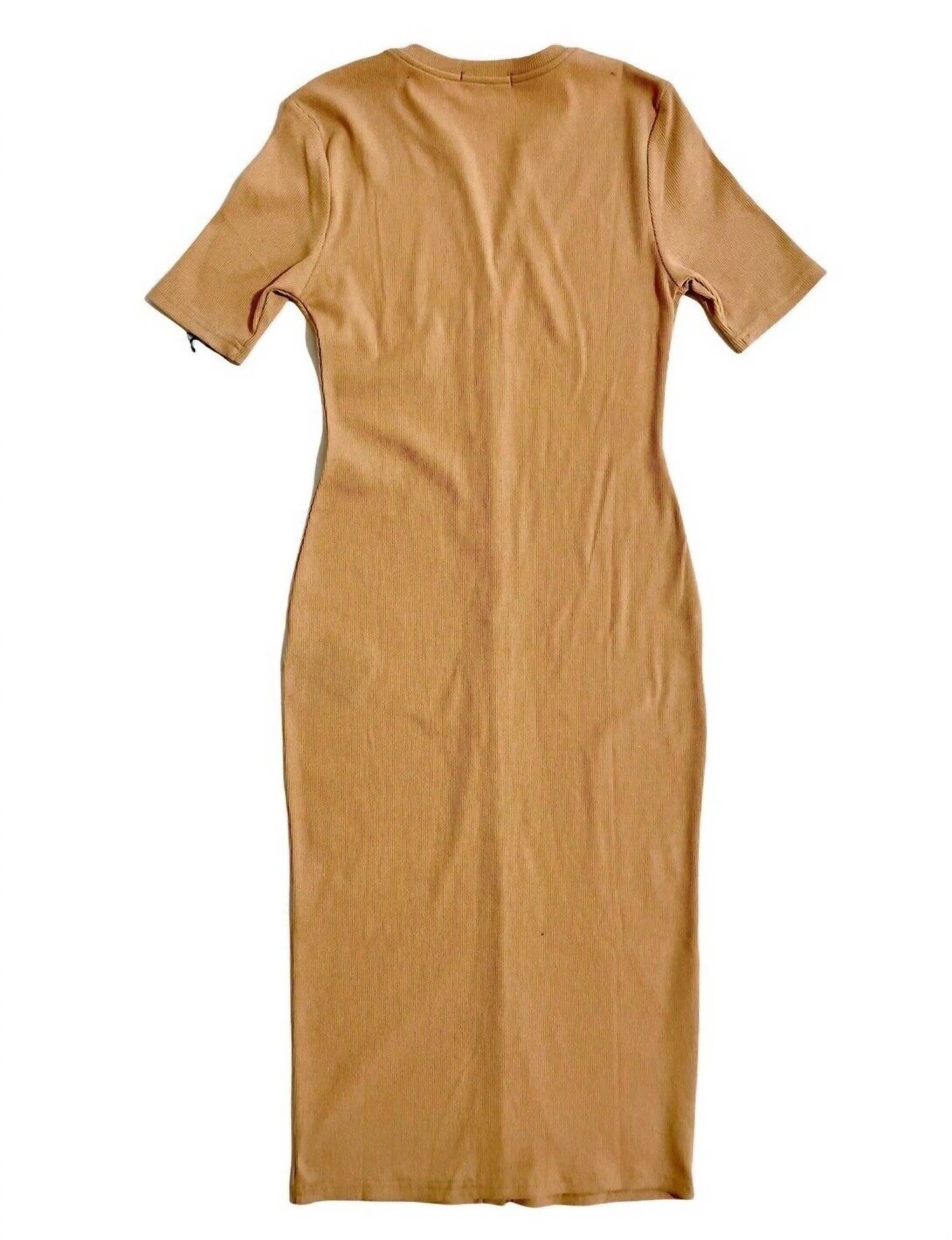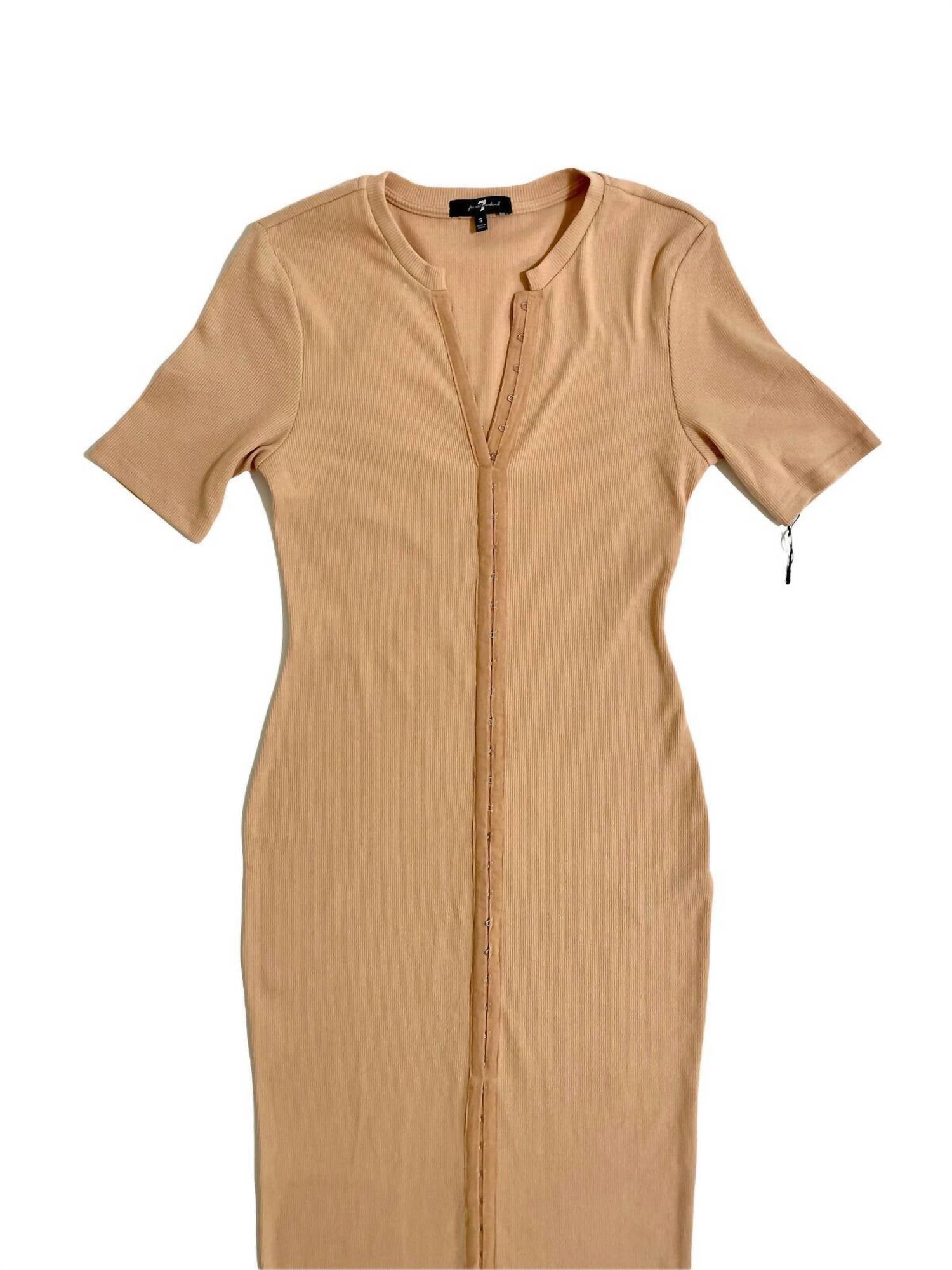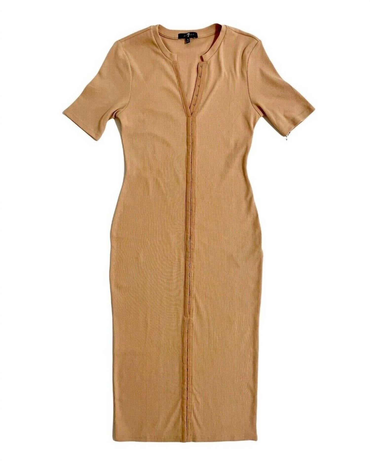 A midi dress so versatile, your options for wearing it are endless. Discover the perfect blend of casual chic and form-fitting elegance with the Bodycon Ribbed Short Sleeve Midi Dress by 7 For All Mankind. This tan dress features a V-neckline and decorative hook and eye closure for a sleek look. Crafted from a rib knit stretch jersey fabric composed of 55% cotton, 42% polyester, and 3% spandex, it offers comfort and flexibility. With a length of 43", this bodycon silhouette is designed to flatter, making it a versatile addition to your wardrobe. Sleeve length is a stylish short sleeve. Easy to care for with machine wash cold instructions.