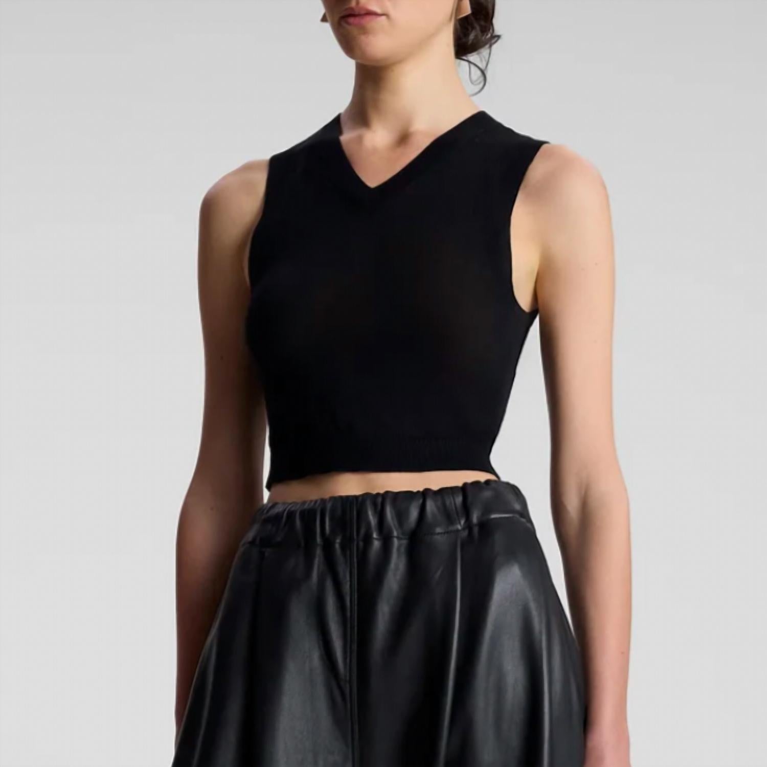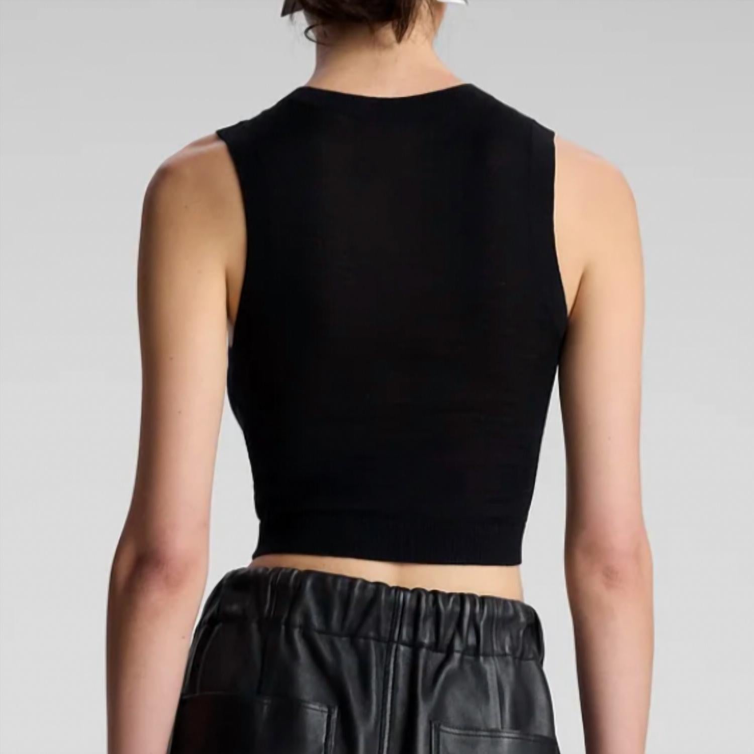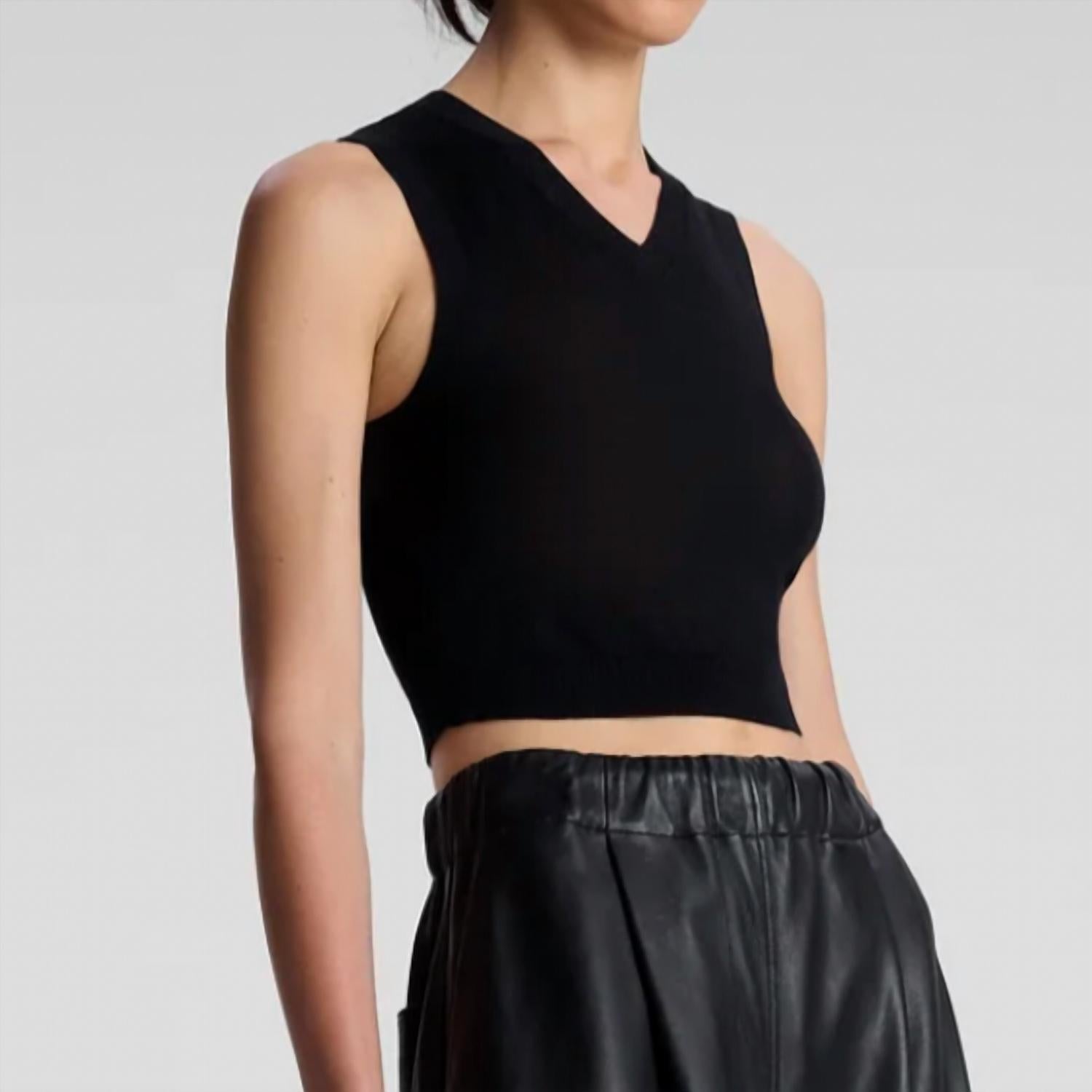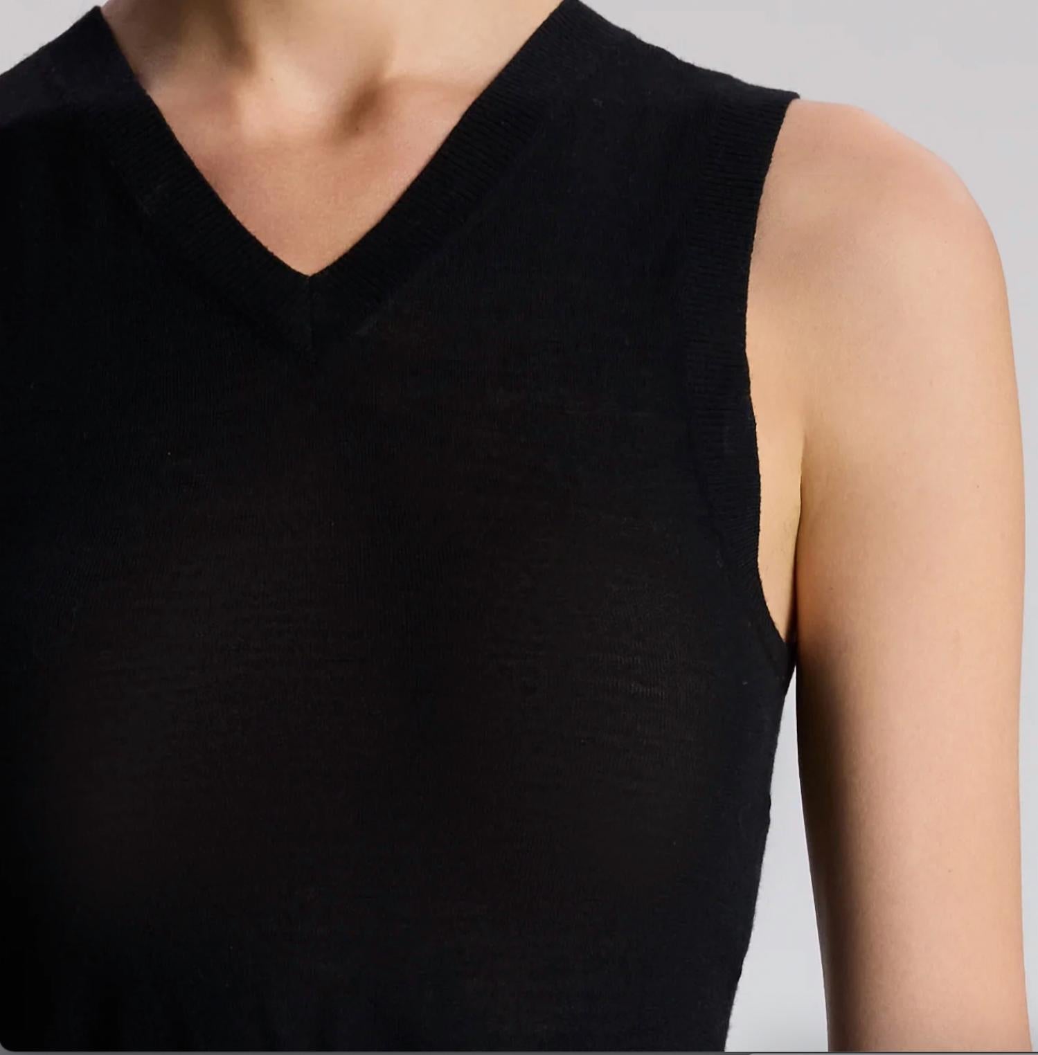 Throw this vest over an all black outfit for a perfectly polished look. Crafted from 100% merino wool in a sophisticated black. Sleeveless vest is designed with a polished V-neckline and ribbed waist for a flattering, fitted silhouette. Features a convenient pull-on style. Measures 17.75" in length.