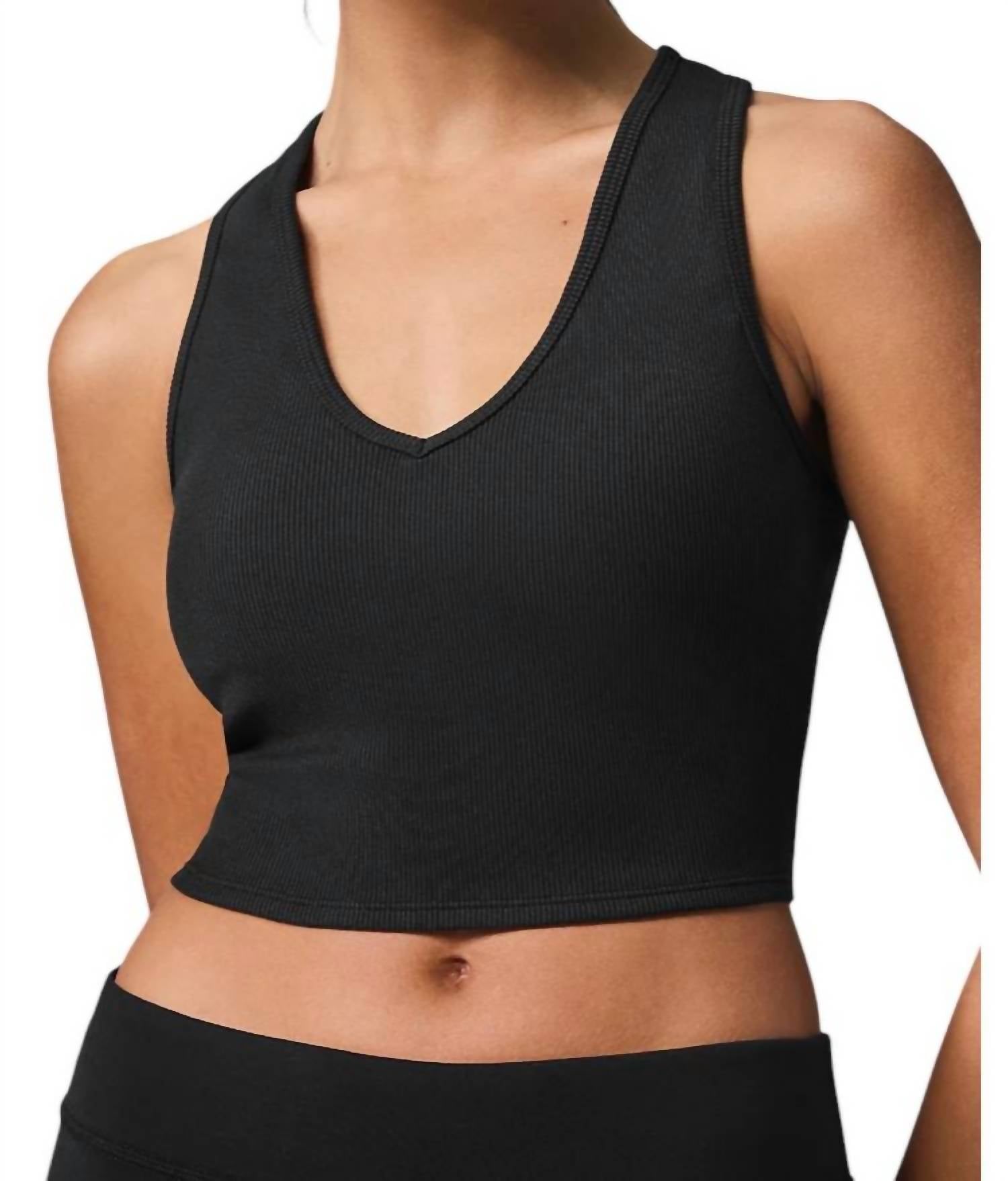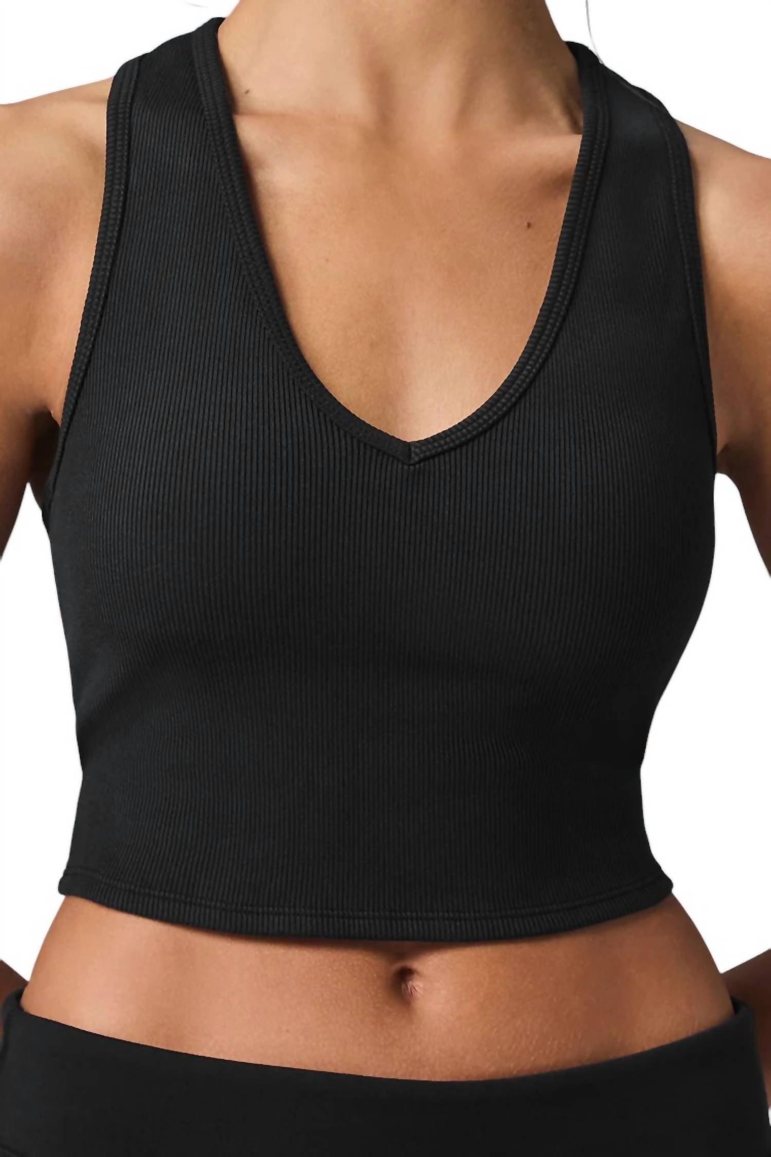 Designed for the ultimate in comfort and style. Sleeveless tank is crafted from a comfy, lightweight ribbed fabric with a sleek V-neck and racerback styling. Offers light-to-medium support with a built-in shelf bra and removable cups. Machine wash cold instructions.