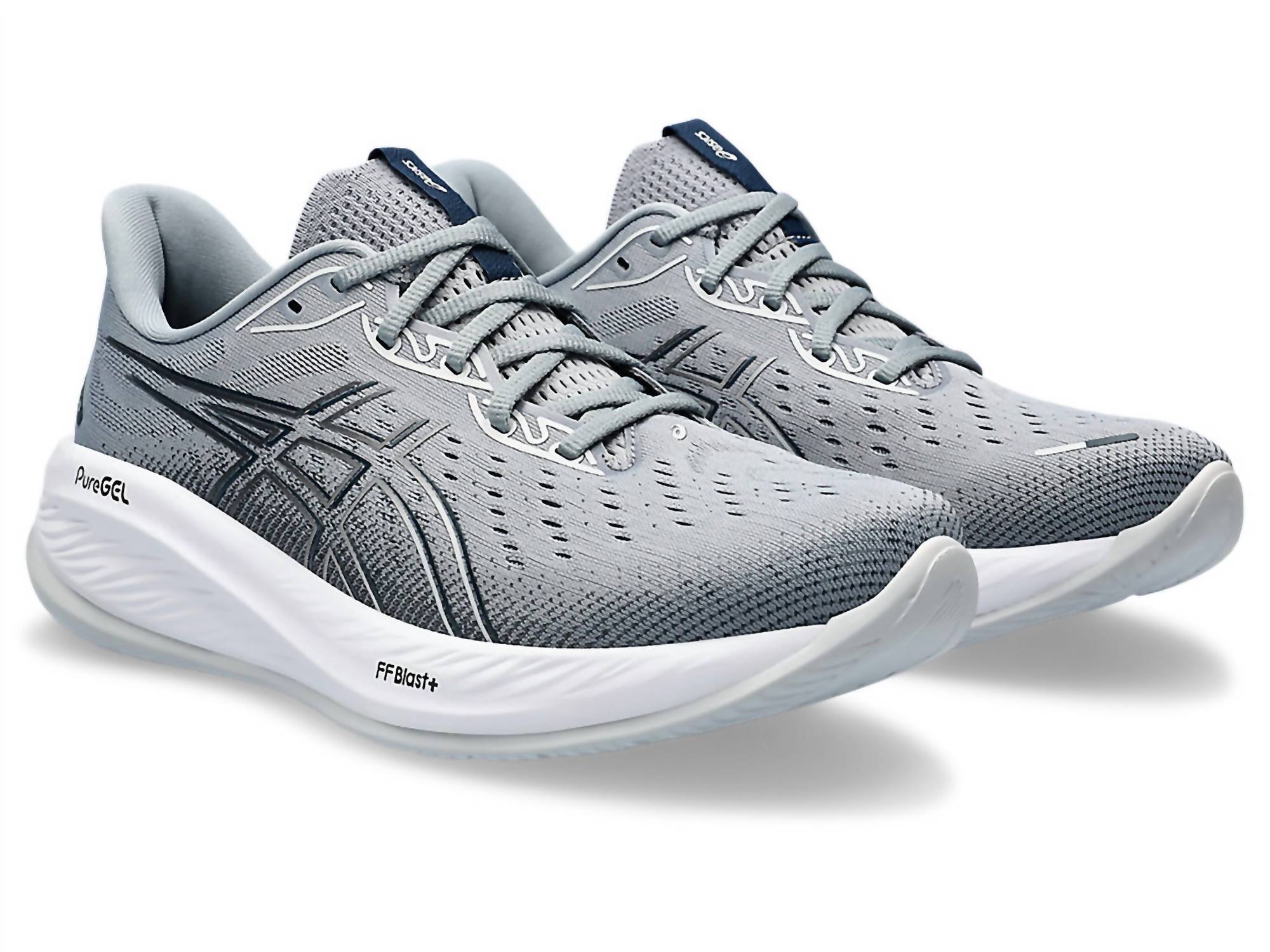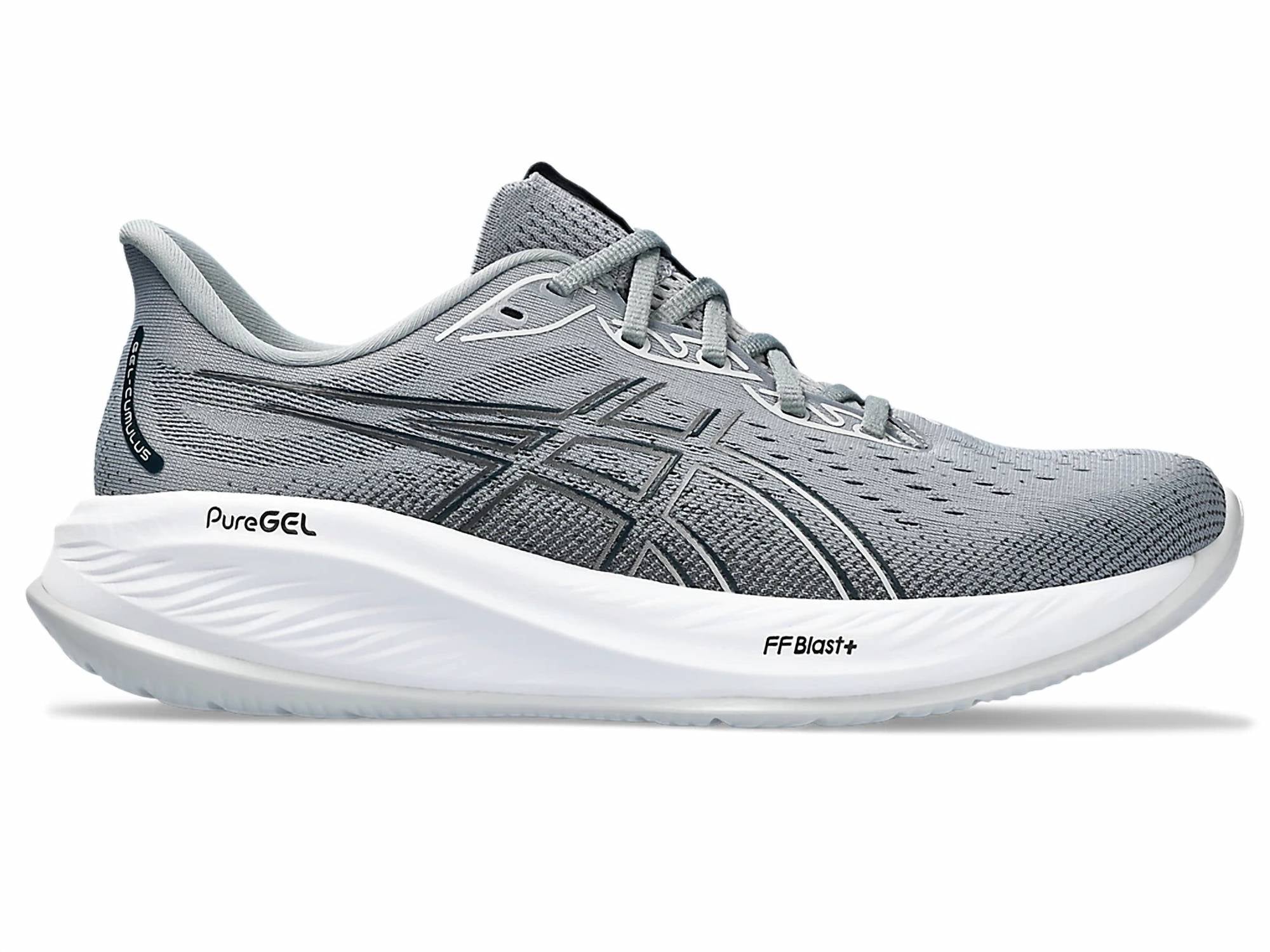 Experience superior comfort with the Men's Gel-Cumulus 26 Running Shoes - Wide by ASICS, designed for road surfaces in a sheet rock/concrete color. Featuring an 8 mm heel drop and weighing 255 g (9 oz), these shoes incorporate FF BLAST™ PLUS technology for lightweight impact absorption and a responsive rebound. The engineered mesh upper enhances breathability, with PureGEL® technology providing cushioning and softer landings. At least 75% of the shoe's main upper material is made from recycled content, and the OrthoLite™ X-30 sockliner ensures a soft step-in feel.