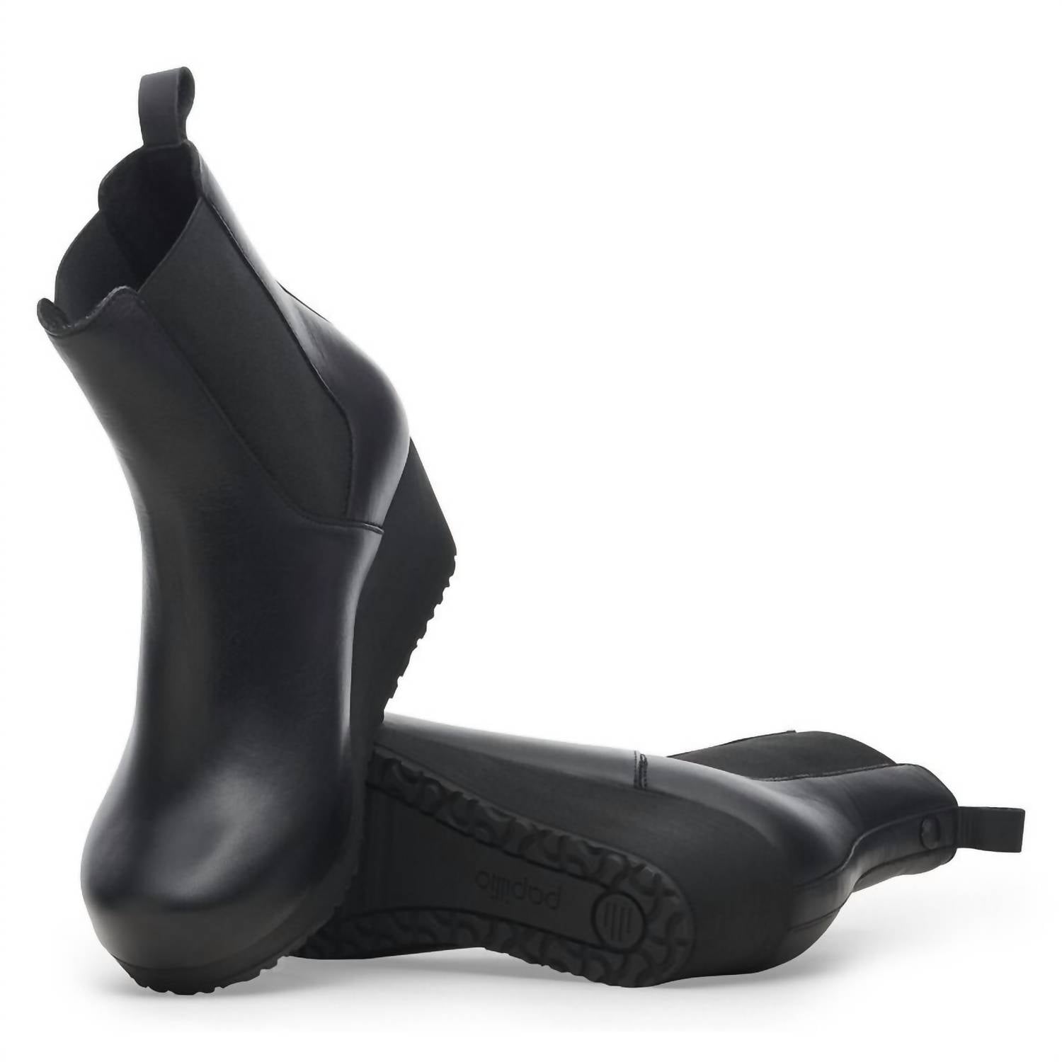 Step up your style with the Women's Ebba Wedge Slip On Ankle Boot by BIRKENSTOCK, crafted from premium natural leather in classic black. These chic ankle boots feature a supportive contoured footbed and a 40mm (1.57-inch) wedge heel, offering both comfort and elegance. Made in Portugal, the boots boast a lightweight PU sole and microfiber footbed lining for optimal comfort. Complete with a medium shoe width and a round toe shape, these boots are designed for the modern woman who values both style and support.